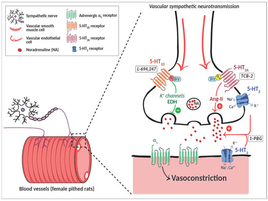 Recent evidence suggests that sex differences in the serotonergic axis may contribute to different 5-hydroxytryptamine (5-HT, serotonin) pathophysiological regulation at the central and peripheral level [11,12,13], possibly due to different rates of serotonin synthesis [14] or 5-HT receptor expression [15,16]. Although 5-HT within the central nervous system (CNS) helps prevent arterial blood pressure increases in both sexes, this effect is more pronounced in males than in females, possibly due to ovarian hormones [17]. At the peripheral level, our group has recently shown that 5-HT contribution to cardiovascular homeostasis is also influenced by sex. In female rats, we have demonstrated that 5-HT1D activation exerts a vascular sympatho-inhibitory action, as it does in males [6,7,18]; in contrast, while in male rats the sympatho-enhancing effect at the vascular level is mediated exclusively by 5-HT3 receptors [7,19,20], in females, the 5-HT2A receptor also contributes to the increase in sympathetic-induced vasoconstrictions [18].