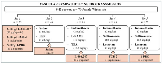 At this point, the animals were randomly divided into five sets (Figure 6). The first set (Figure 6) was performed to confirm the previous results [18]. The animals were administered a continuous i.v. perfusion of the selective 5-HT1D (L-694,247; 10 µg/kg/min), 5-HT2A (TCB-2; 1 µg/kg/min), or 5-HT3 (1-PBG; 10 µg/kg/min) receptor (sub)type agonist (n = 5 for each agonist). Then, two new E1 and E2 S-R curves were carried out equally to E0.