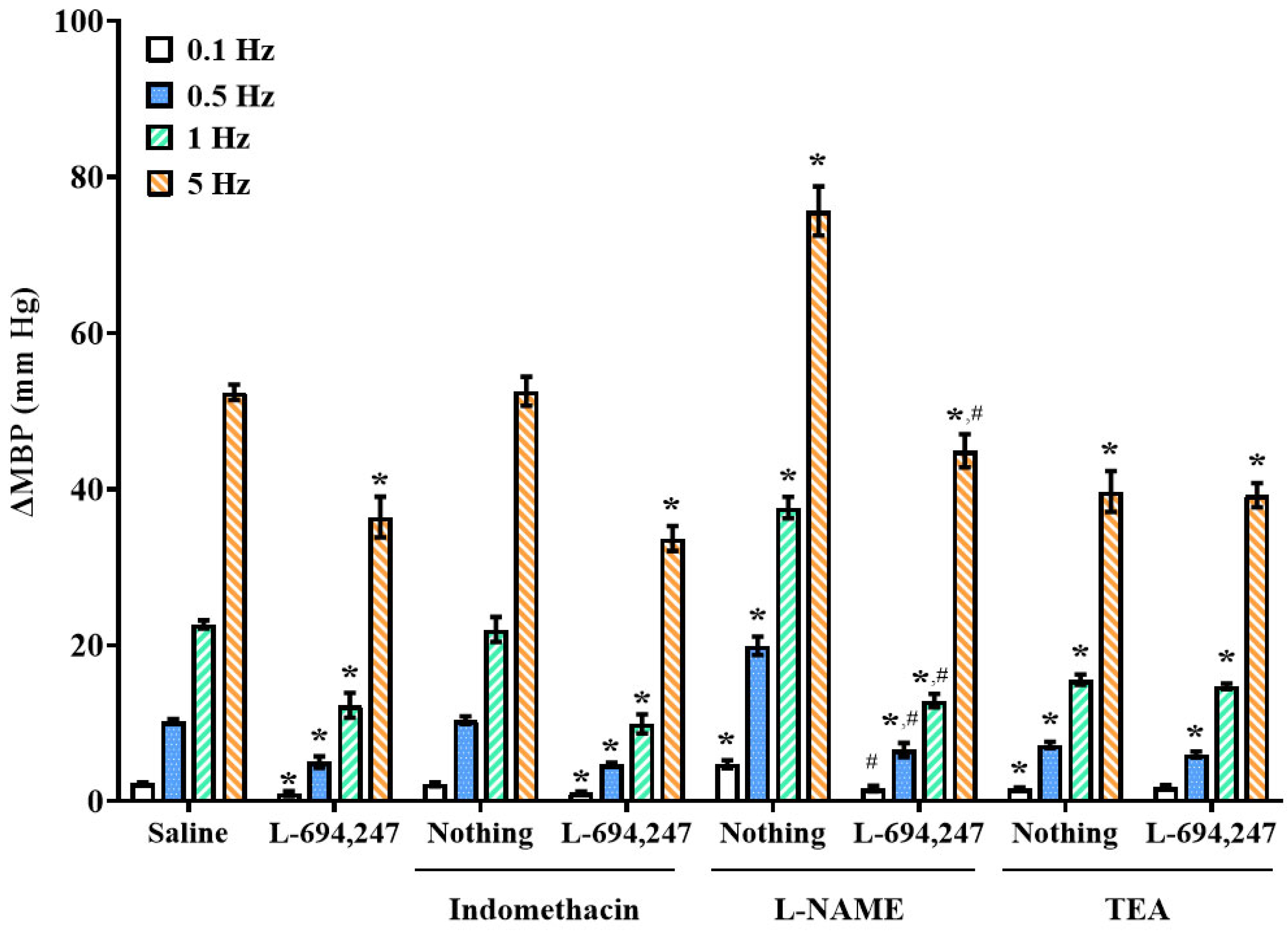 2.4. Impact of i.v. Administration of Indomethacin, L-NAME, or TEA on the L-694,247-Induced Serotonergic Sympatho-Inhibitory Effect in Female Rats