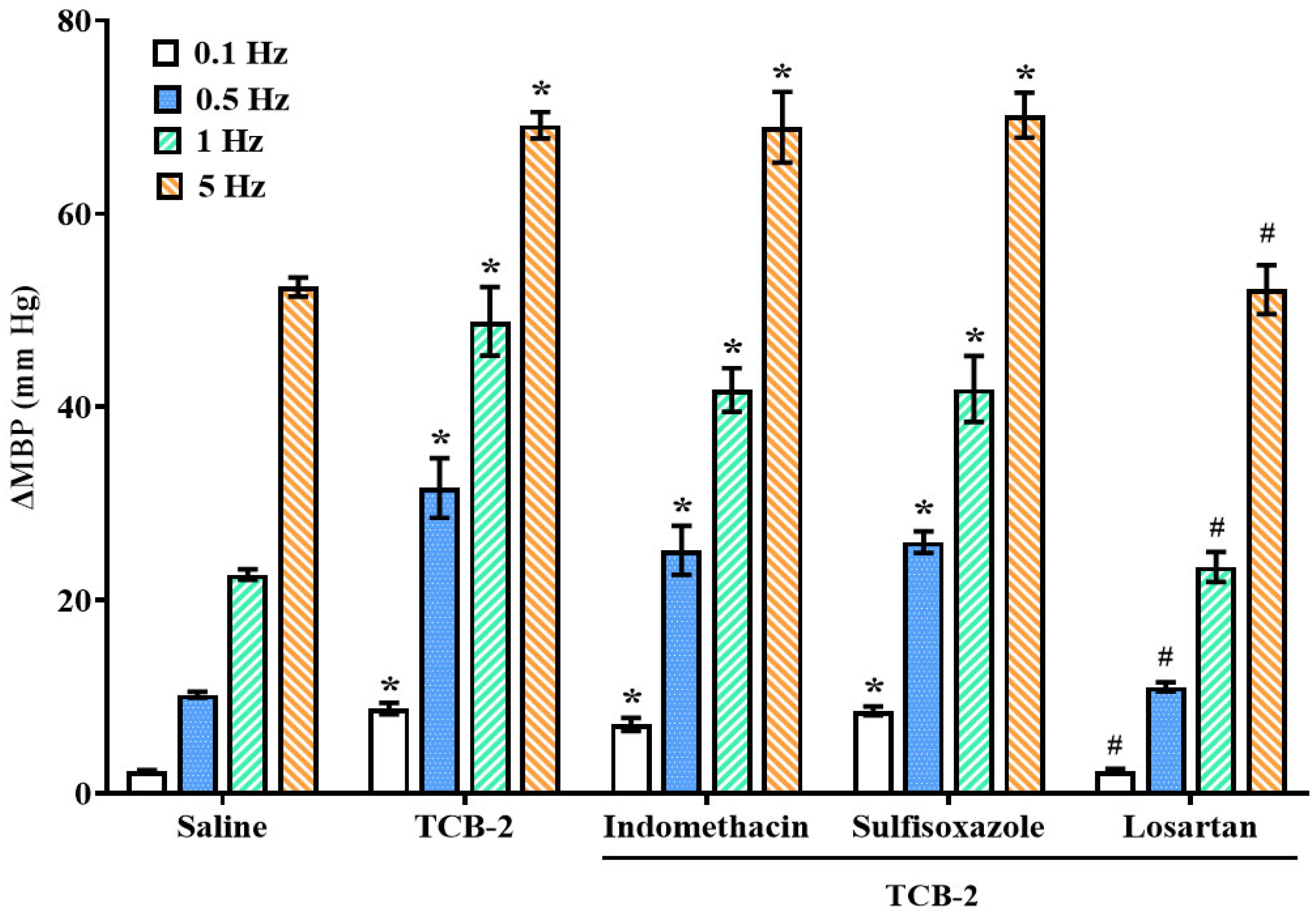 2.5. Influence of i.v. Administration of Indomethacin, Sulfisoxazole, or Losartan on the TCB-2 or 1-PBG Sympathetic Potentiation in Female Rats