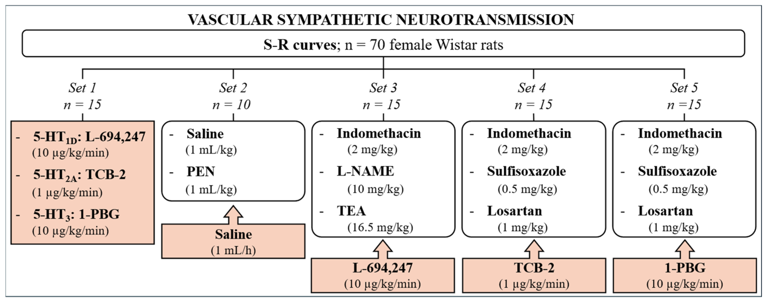 - Terol-Úbeda, A.C.; Fernández-González, J.F.; Roldán-Hernández, C.A.; Martín, M.L.; Morán, A.; García-Domingo, M.; García-Pedraza, J.Á. Sex influence on serotonergic modulation of the vascular noradrenergic drive in rats. Br. J. Pharmacol. 2025, 182, 1025–1037. [Google Scholar] [CrossRef]