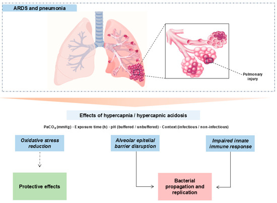 | O’Croinin DF et al., 2008 [21] | In vivo (rats) | Infectious (pneumonia, no antibiotics) | Inspired CO2: 5%; 48 h; unbuffered metabolic acidosis | Harmful: Neutrophil phagocytosis ↓; ALI severity ↑ → worse infection control |