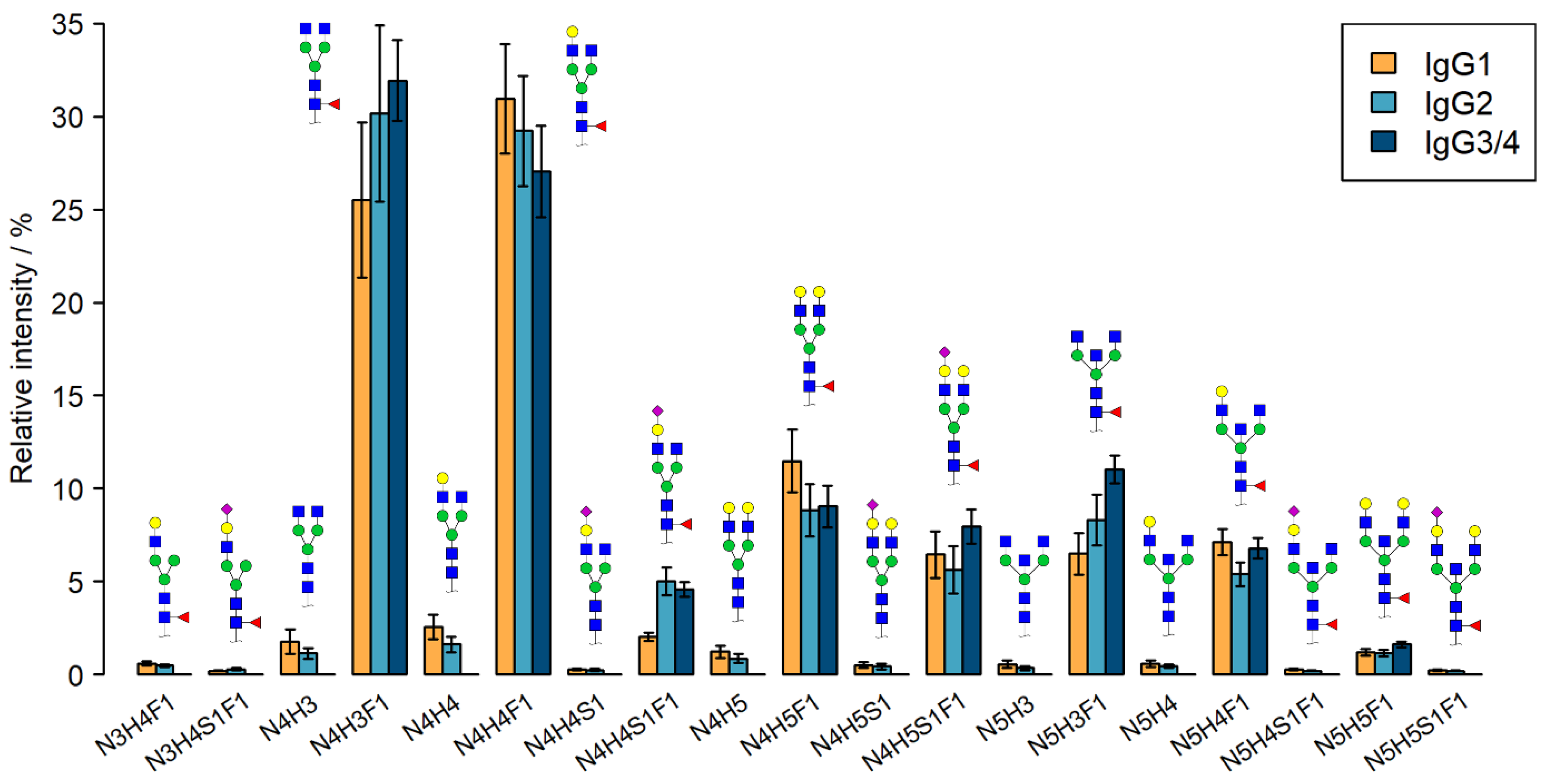- Selman, M.H.J.; Niks, E.H.; Titulaer, M.J.; Verschuuren, J.J.G.M.; Wuhrer, M.; Deelder, A.M. IgG Fc N-Glycosylation Changes in Lambert-Eaton Myasthenic Syndrome and Myasthenia Gravis. J. Proteome Res. 2011, 10, 143–152. [Google Scholar] [CrossRef] [PubMed]