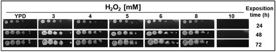 To determine the concentrations of H2O2 that inhibited the growth of Y. lipolytica cells, the serial dilution plate method [,,] was used. Accordingly, tenfold serial dilutions (cell density OD600 = 1, until 1 × 10−6) of a suspension of Y. lipolytica cells growing in the logarithmic phase were prepared, and 3 μL of each dilution was spotted on YPD plates, added—or not—with different concentrations of H2O2 [1–10 mM]. Subsequently, the plates were covered with aluminum foil to avoid light exposure, incubated upside down at 28 °C, and photographed (Gel Doc-It Imaging System, UVP, Upland, CA, USA) every 24 h, for 3 days.