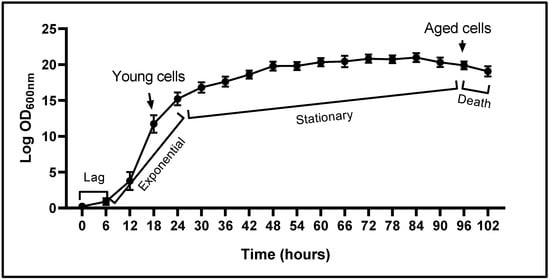 Growth curve of Yarrowia lipolytica P01a strain in YPD culture medium. Y. lipolytica cells were incubated at 28 °C and 200 rpm. OD600 values (average of three independent experiments) were determined at different times, as indicated (until 102 h). The figure shows the characteristic phases in cell growth pattern: phase lag, exponential growth, stationary phase, and the beginning of the death phase. Arrow indicated the culture times which cells (young and aged) were obtained.