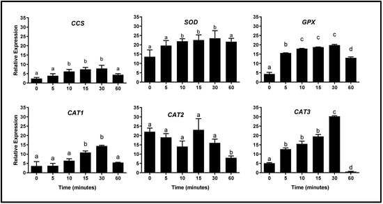 For the genes that encoded for catalases, the CAT1 gene expression values increased (p < 0.05) at 15–30 min of exposure to H2O2 while, at 60 min after exposure, the expression of this gene returned to the baseline values; however, it is interesting to note that the expression values were lower (considering the relative expression values observed in the other genes). The CAT2 gene expression showed slight variations without presenting significant changes and, after 60 min of exposure, the values decreased below the baseline level.