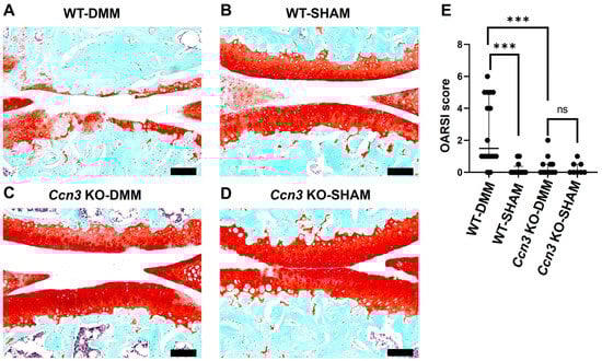 To establish the DMM model of osteoarthritis, surgery was performed on both knee joints. Under general anesthesia, the medial meniscotibial ligament was transected bilaterally in WT and Ccn3 KO mice to induce joint destabilization []. In the sham-operated groups, skin incisions and wound closure were performed on both knees without meniscal destabilization.