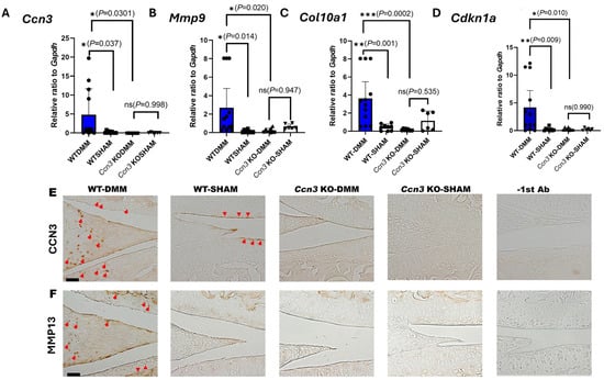 Ccn3 deletion attenuates the expression of cartilage-degrading enzymes in OA (RT-qPCR and immunohistochemistry). (A–D) RT-qPCR analysis of cartilage from Ccn3-WT and Ccn3-KO mice subjected to DMM-induced OA or sham surgery. Gene expression levels of Ccn3, Mmp9, Col10a1, and Cdkn1a/p21 were normalized to Gapdh. WT-DMM mice exhibited significantly higher expression of these catabolic and hypertrophic markers, as well as Cdkn1a/p21, compared to sham controls, indicating active cartilage degradation. * p < 0.05, ** p < 0.01, *** p < 0.001, ns = not significant. (E,F) Immunohistochemical analysis showed increased staining of CCN3 (arrow) and MMP-13 (arrowhead) in Ccn3 WT-DMM compared to WT-Sham, indicating elevated cartilage degradation. In contrast, Ccn3 KO-DMM exhibited minimal staining for MMP-13, comparable to Ccn3 KO-Sham, suggesting reduced matrix breakdown. CCN3 staining was absent in both Ccn3 KO groups, confirming successful knockout. Scale bar = 50 µm.