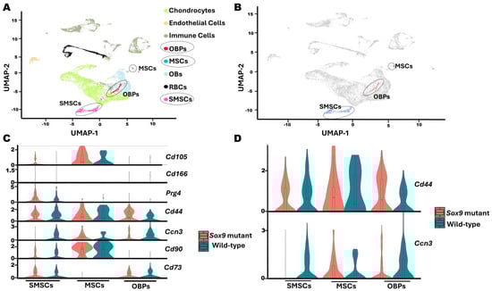 scRNA-seq of postnatal day 13 mouse cartilage indicates Ccn3-expressing clusters also express Cd44. (A) UMAP visualization shows 8 identified cell clusters from combined Sox9 mutant and wild-type (WT) cartilage samples. (B) UMAP plot displaying the CCN3-expressing clusters (colors represent clusters). SMSCs, MSCs, and OBPs are the major clusters exhibiting enriched Ccn3 expressions. (C) Violin plots illustrate the expression of Ccn3 and key chondroprogenitor-associated markers (Cd44, Cd90 (Thy1), Cd73 (Nt5e), Cd105 (Eng), Cd166 (Alcam), and Prg4) across Ccn3-enriched clusters. Notably, Cd44 was the only marker consistently expressed in all Ccn3-positive clusters. (D) Violin plots of Ccn3 and Cd44 expression specifically within the Ccn3-expressing clusters (SMSCs, MSCs, and OBPs) compared with Sox9 mutant (red) and WT (blue) samples. These analyses demonstrate the rationale for cluster selection and marker prioritization in evaluating the relationship between Ccn3 and progenitor identity.