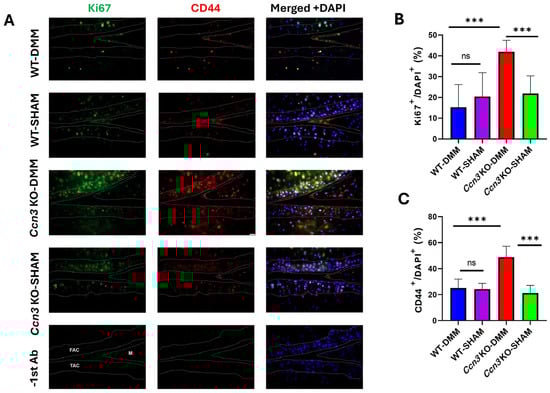 Double immunofluorescence staining of CD44 and Ki67 in WT and KO mice under OA and sham conditions. (A) Representative immunofluorescence images showing co-staining of CD44 (red) and Ki67 (green) in articular cartilage from Ccn3 WT and Ccn3 KO mice subjected to OA induction or sham surgery. Increased Ki67 staining is observed in the Ccn3 KO-DMM group compared to both the Ccn3 KO-Sham and Ccn3 WT (DMM) groups, suggesting enhanced proliferative activity in the absence of Ccn3 under OA conditions. The dotted line indicates FAC, TAC, and M (FAC, femoral articular cartilage; TAC, tibial articular cartilage; M, meniscus). (B,C) Percentages of Ki67+ and CD44+ cells (green/red) relative to the total number of nucleated cells (DAPI+, blue) within the FAC, TAC, and M. WT-DMM (n = 4), WT-Sham (n = 3), Ccn3 KO-DMM (n = 3), and Ccn3 KO-Sham (n = 2). p < 0.001 (***), ns = not significant, scale bar: 20 µm.