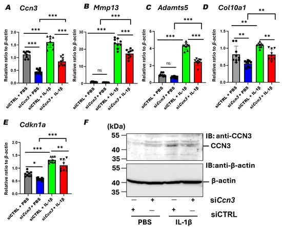 Ccn3 knockdown attenuates IL-1β-induced expression of cartilage degradation and senescence markers in RCS cells in vitro. (A–F) RT-qPCR and Western blot analyses of RCS chondrocyte-like cells transfected with either control siRNA (siCTRL) or Ccn3-targeting siRNA (siCcn3) at 100 nM. After 48 h, cells were stimulated with IL-1β (5 ng/mL) for an additional 24 h to mimic osteoarthritic conditions. (A–E) Messenger RNA expression of Ccn3, Mmp13, Adamts5, Col10a1, and Cdkn1a, respectively. IL-1β significantly upregulated all five genes, and these increases were attenuated by siCcn3. All expression values were normalized to β-actin. (F) Representative Western blot showing CCN3 protein (40–55 kDa) with β-actin as a loading control. IL-1β increased CCN3 protein levels, which were effectively reduced by siCcn3. Data are presented as mean ± SD. Statistical analysis was performed using one-way ANOVA, followed by Dunnett’s post hoc test. * p < 0.05; ** p < 0.01; *** p < 0.001; ns, not significant. (n = 3 per group; all experiments performed in triplicate).