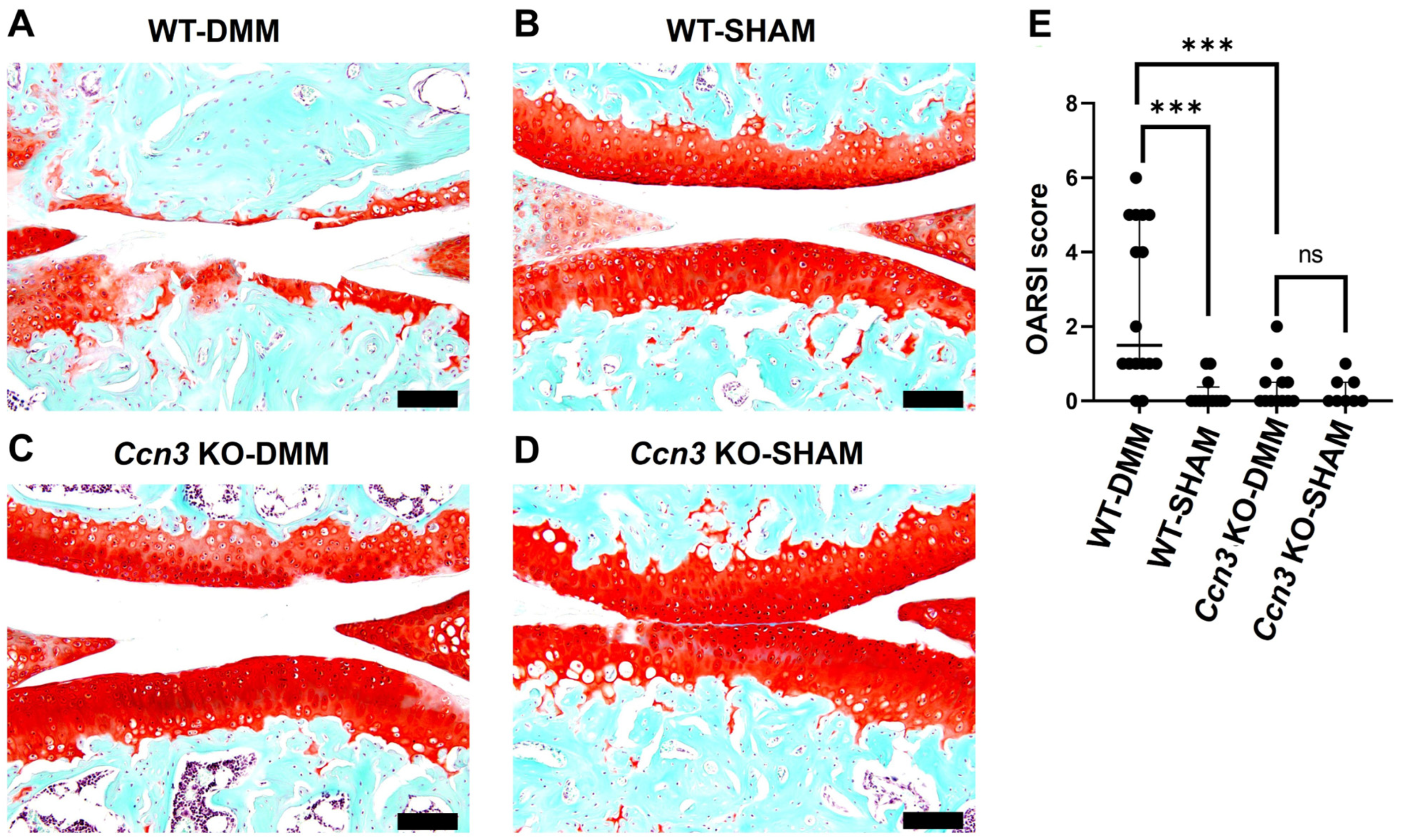 2.1. Ccn3 WT (DMM) Exhibits Severe Cartilage Degradation, While Ccn3 KO (DMM) Demonstrates Protective Effects