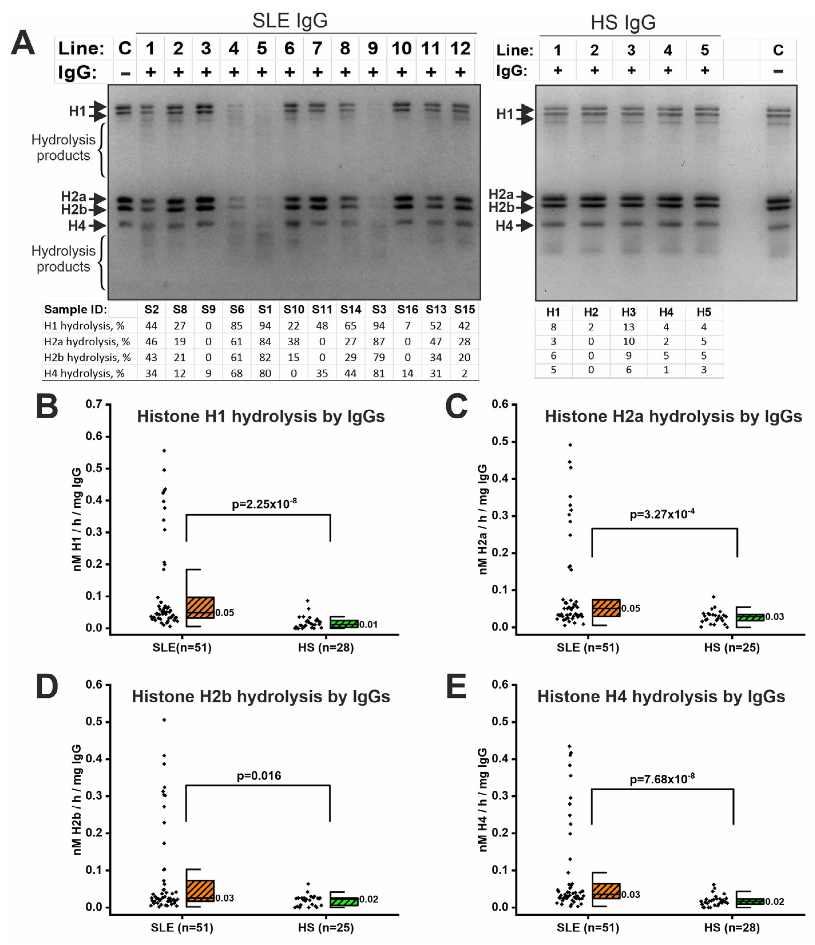 - Magorivska, I.B.; Bilyy, R.O.; Havrylyuk, A.M.; Chop’yak, V.V.; Stoika, R.S.; Kit, Y.Y. Anti-histone H1 IgGs from Blood Serum of Systemic Lupus Erythematosus Patients Are Capable of Hydrolyzing Histone H1 and Myelin Basic Protein. J. Mol. Recognit. 2010, 23, 495–502. [Google Scholar] [CrossRef]