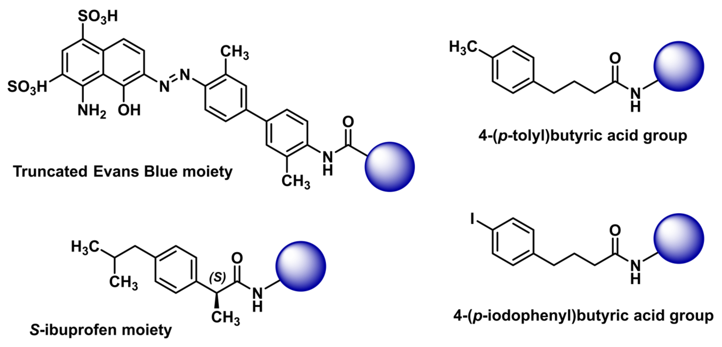 - Brandt, M.; Cardinale, J.; Giammei, C.; Guarrochena, X.; Happl, B.; Jouini, N.; Mindt, T.L. Mini-Review: Targeted Radiopharmaceuticals Incorporating Reversible, Low Molecular Weight Albumin Binders. Nucl. Med. Biol. 2019, 70, 46–52. [Google Scholar] [CrossRef]