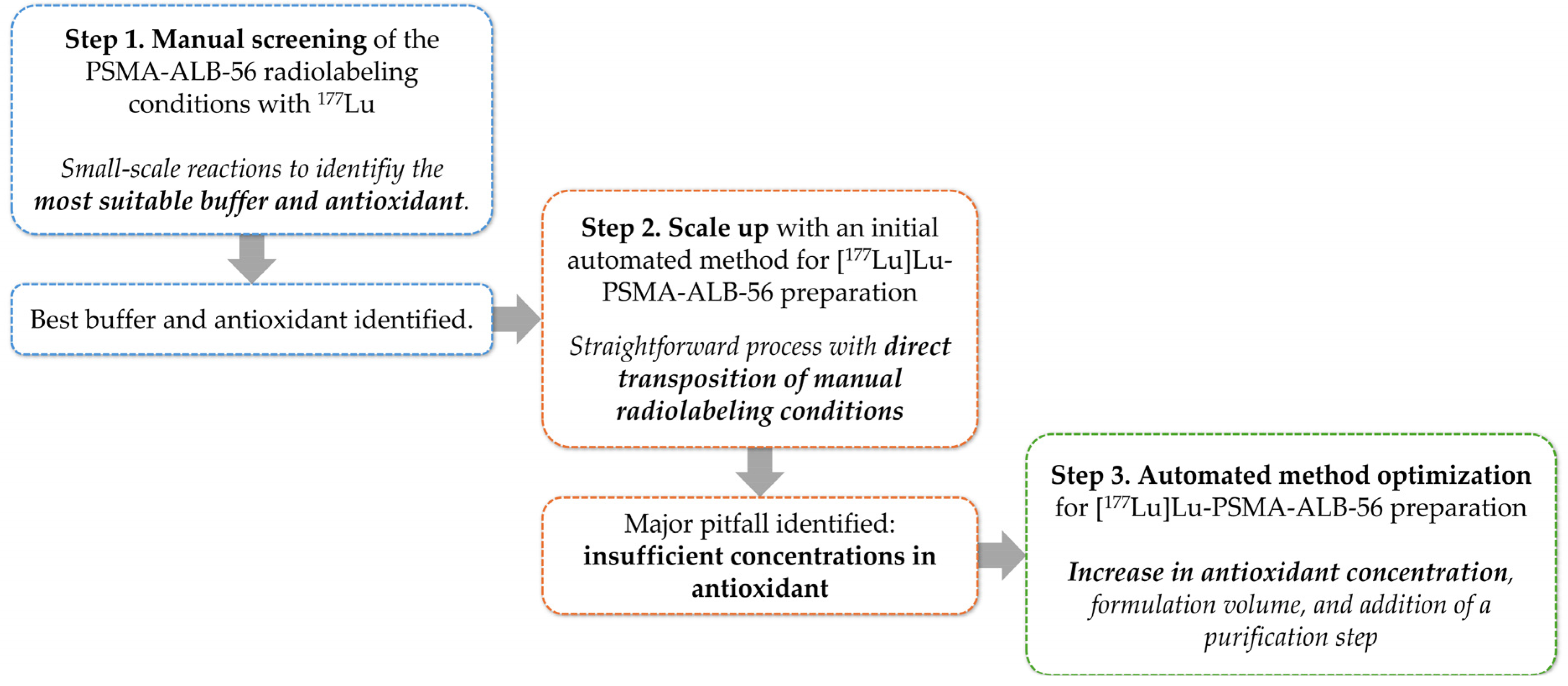 Vanney, J.; Rubira, L.; Torchio, J.; Fersing, C. Tailored Reaction Conditions and Automated Radiolabeling of [177Lu]Lu-PSMA-ALB-56 in a 68Ga Setting: The Critical Impact of Antioxidant Concentrations. Int. J. Mol. Sci. 2025, 26, 9642. https://doi.org/10.3390/ijms26199642
