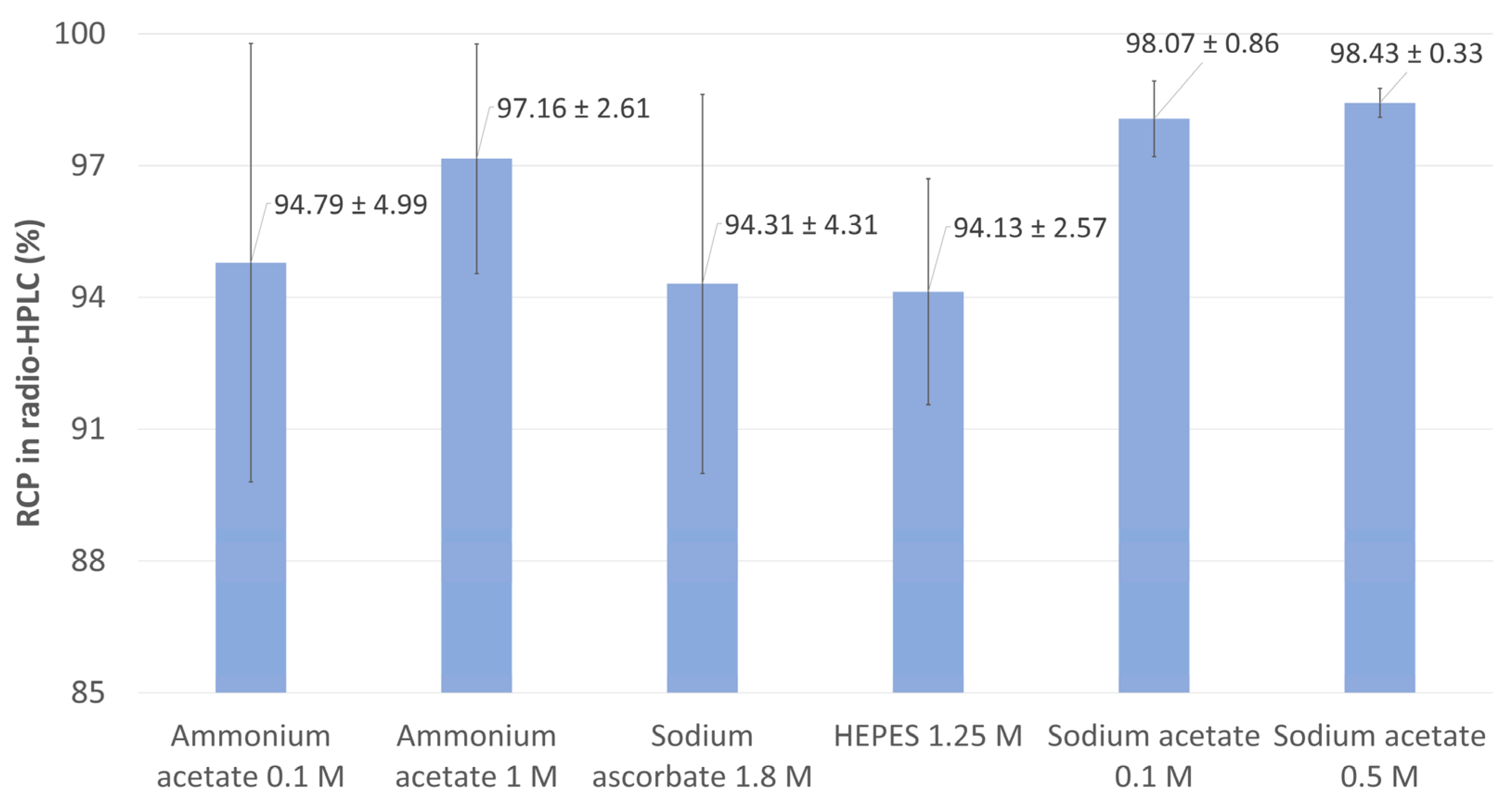 - Bauwens, M.; Chekol, R.; Vanbilloen, H.; Bormans, G.; Verbruggen, A. Optimal Buffer Choice of the Radiosynthesis of 68Ga–Dotatoc for Clinical Application. Nucl. Med. Commun. 2010, 31, 753–758. [Google Scholar] [CrossRef]