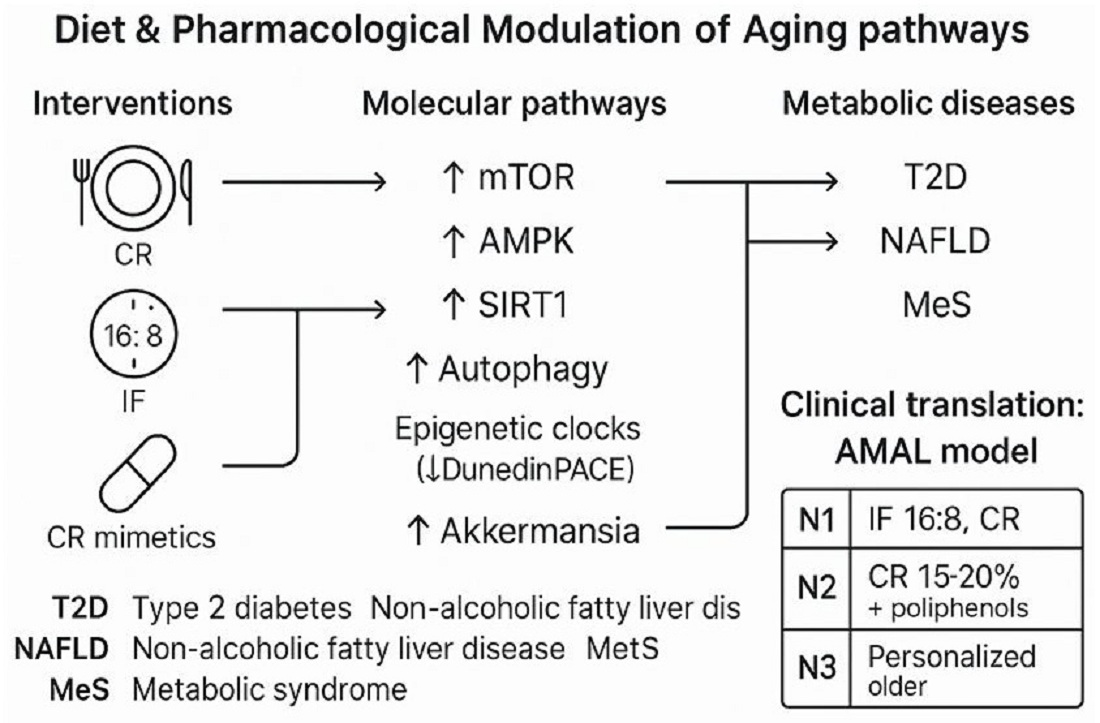 Dietary and Pharmacological Modulation of Aging-Related Metabolic Pathways: Molecular Insights, Clinical Evidence, and a Translational Model