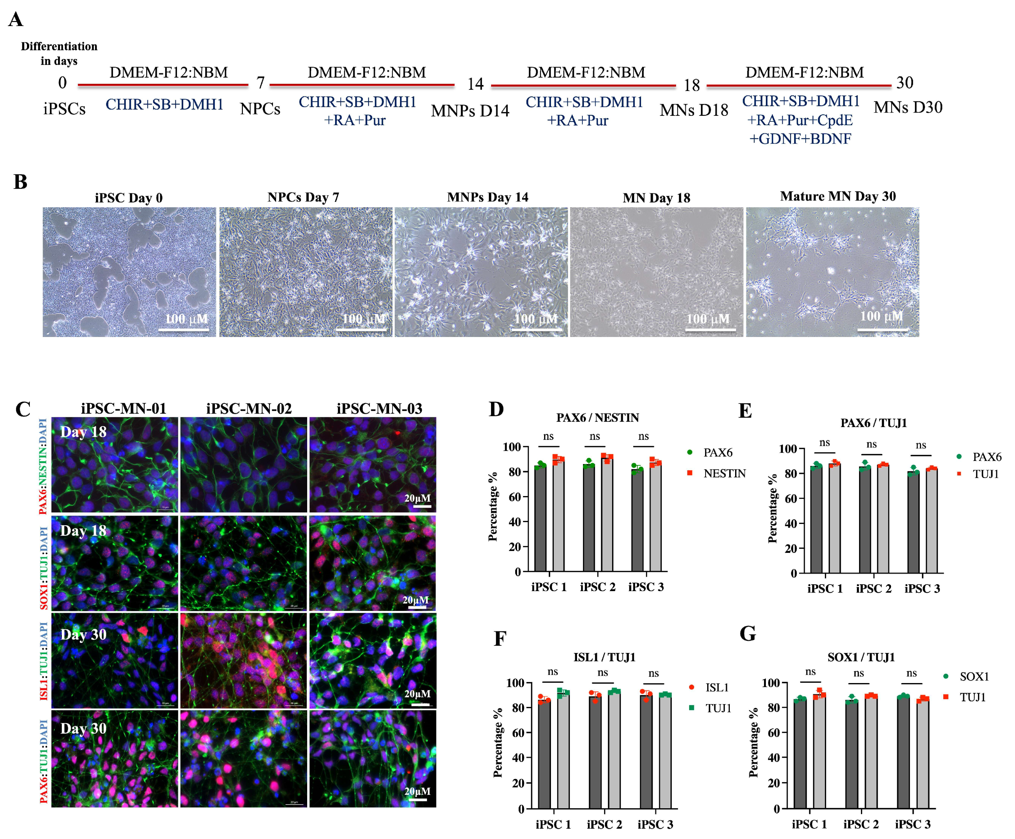 2.2. Confirmation of iPSC Differentiation into Motor Neurons (MNs)