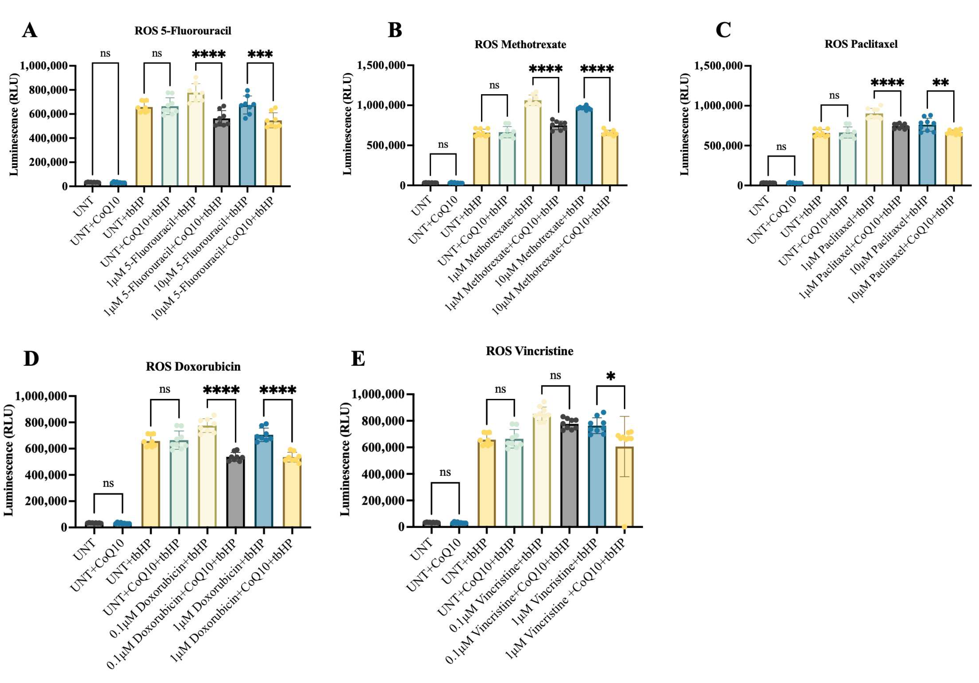2.3. Potential Protective Effects of CoQ10 on iPSC-MNPs Viability Following Exposure to Chemotherapeutic Agents