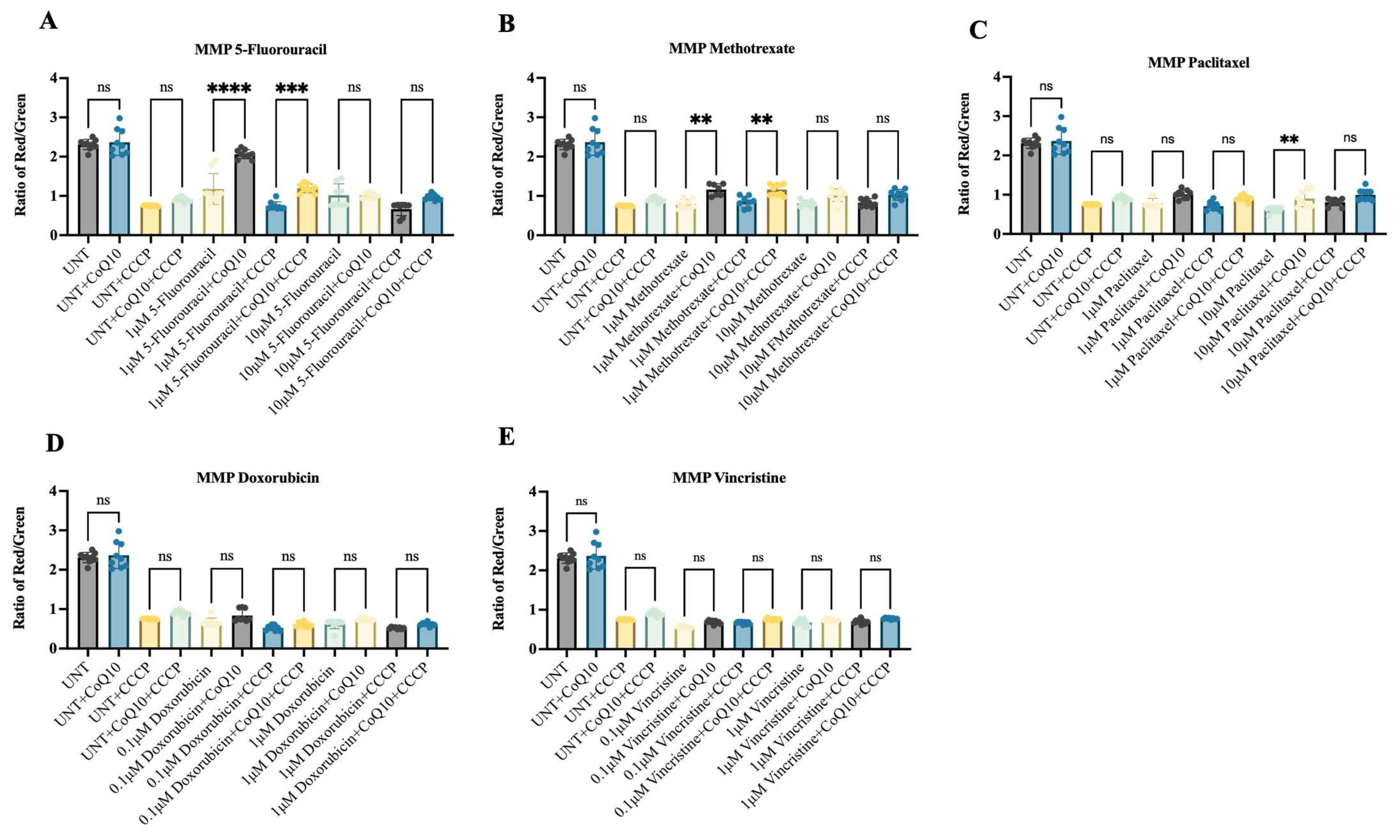 2.5. Effect of CoQ10 on Mitochondrial Membrane Potential (MMP) in Chemotherapy-Treated iPSC-MNPs