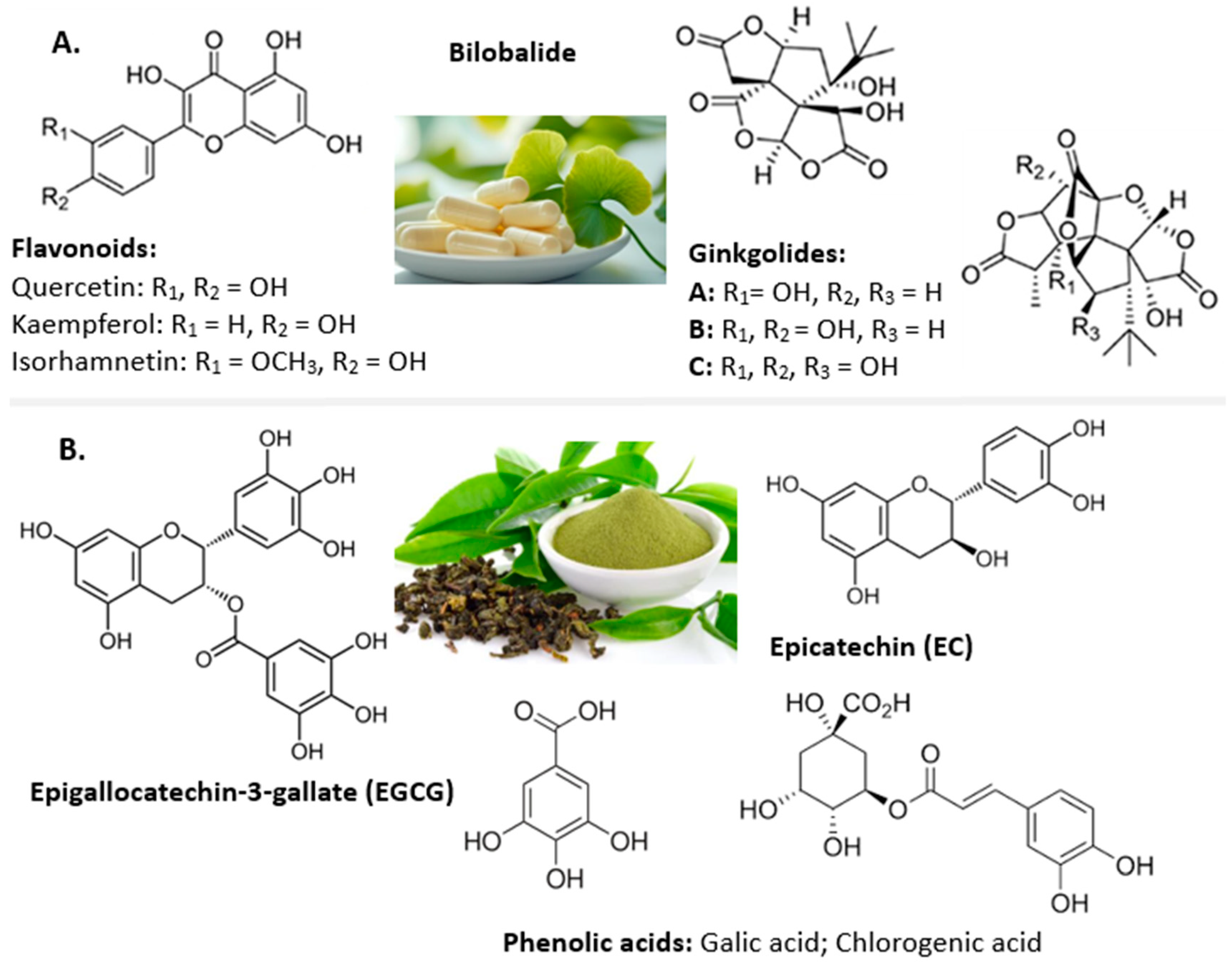 - Biernacka, P.; Adamska, I.; Felisiak, K. The Potential of Ginkgo biloba as a source of biologically active compounds—A Review of the Recent Literature and Patents. Molecules 2023, 28, 3993. [Google Scholar] [CrossRef]