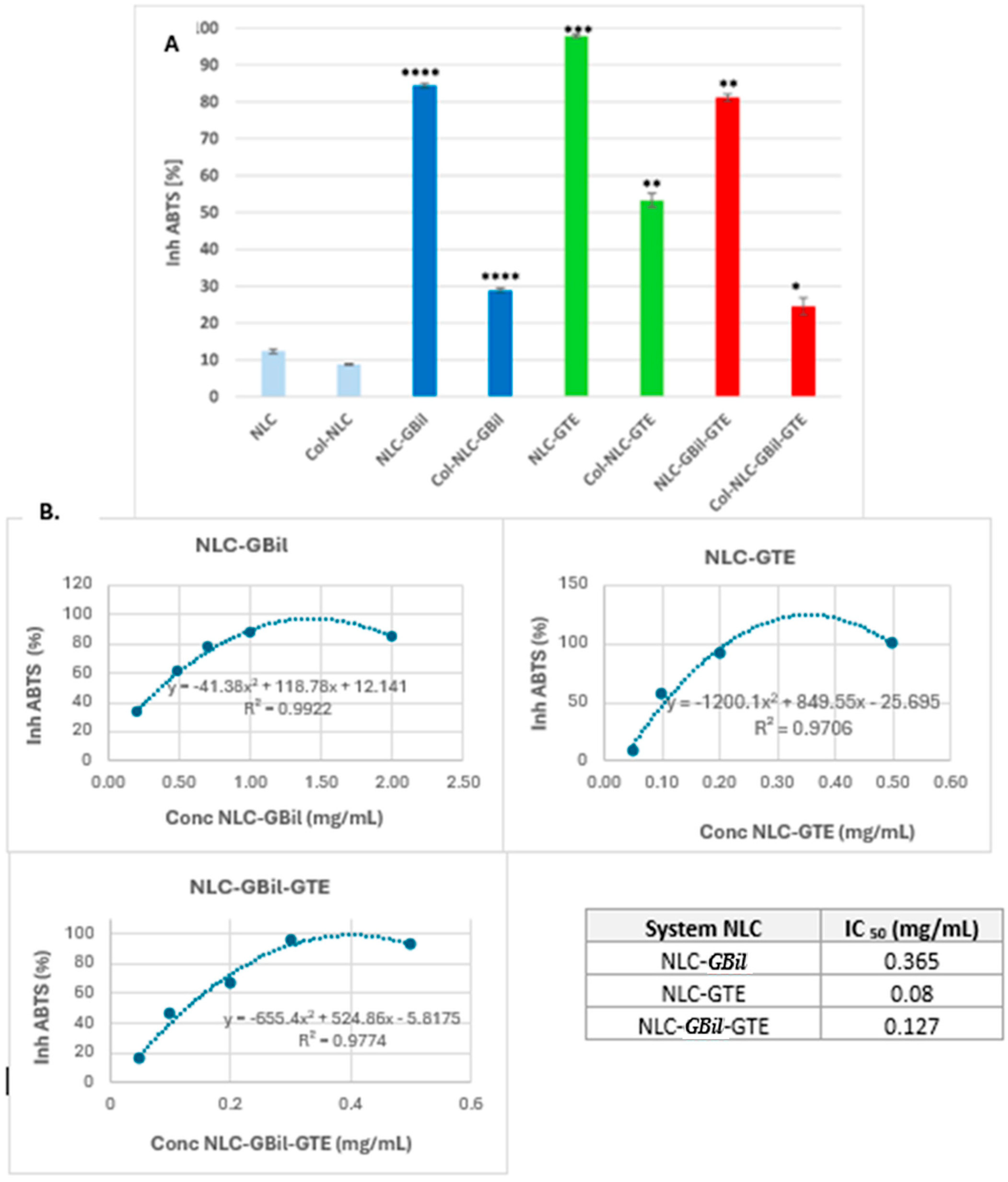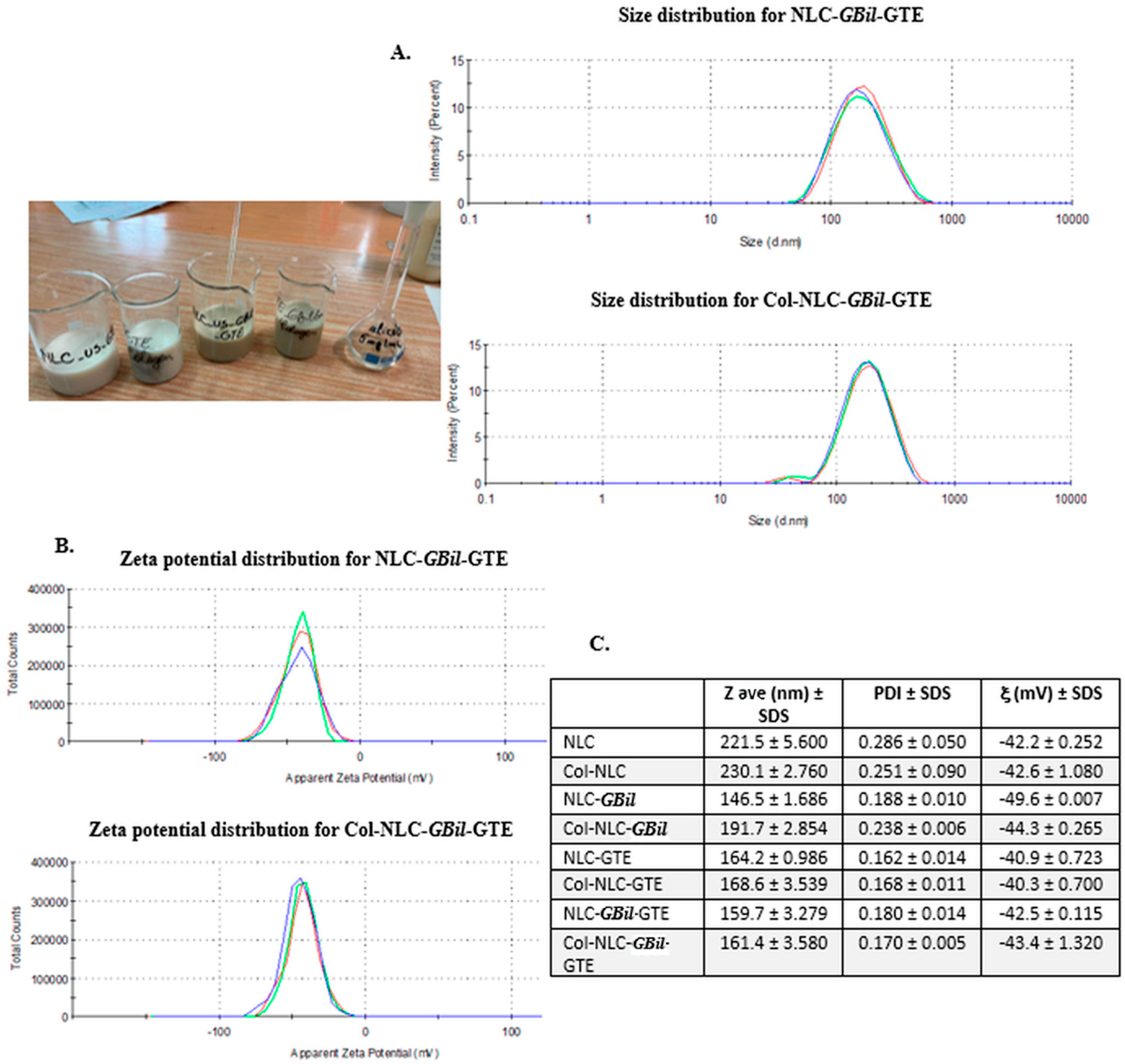 3.2. Obtaining of NLC and Collagen-Decorated NLC Loaded with GBil and GTE