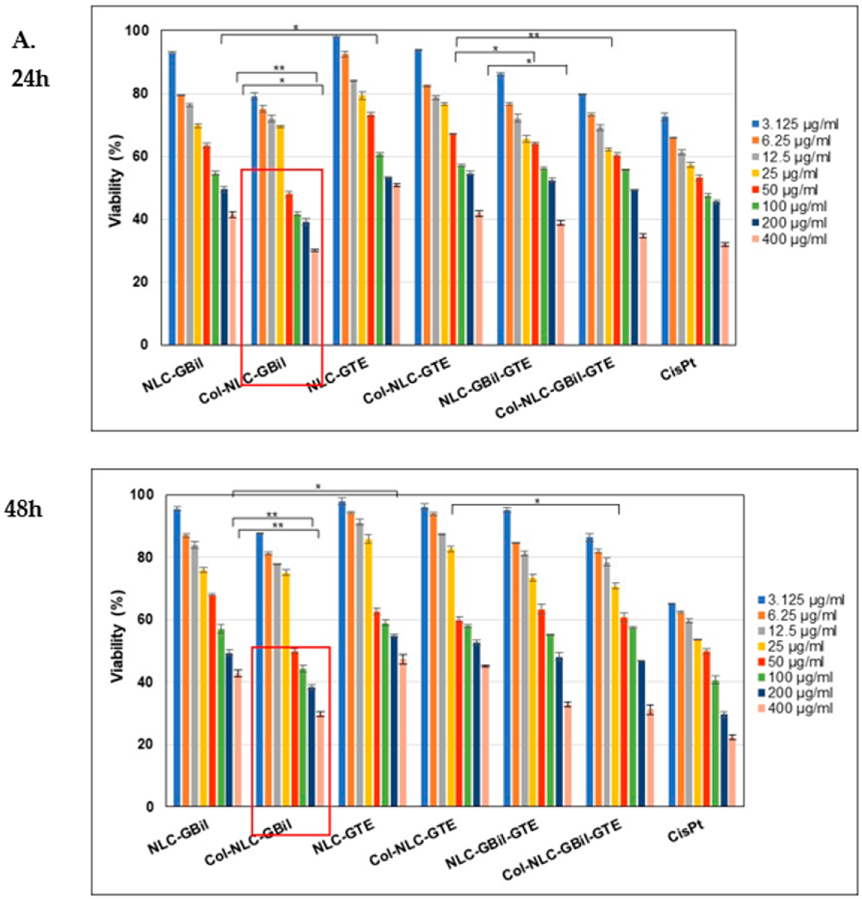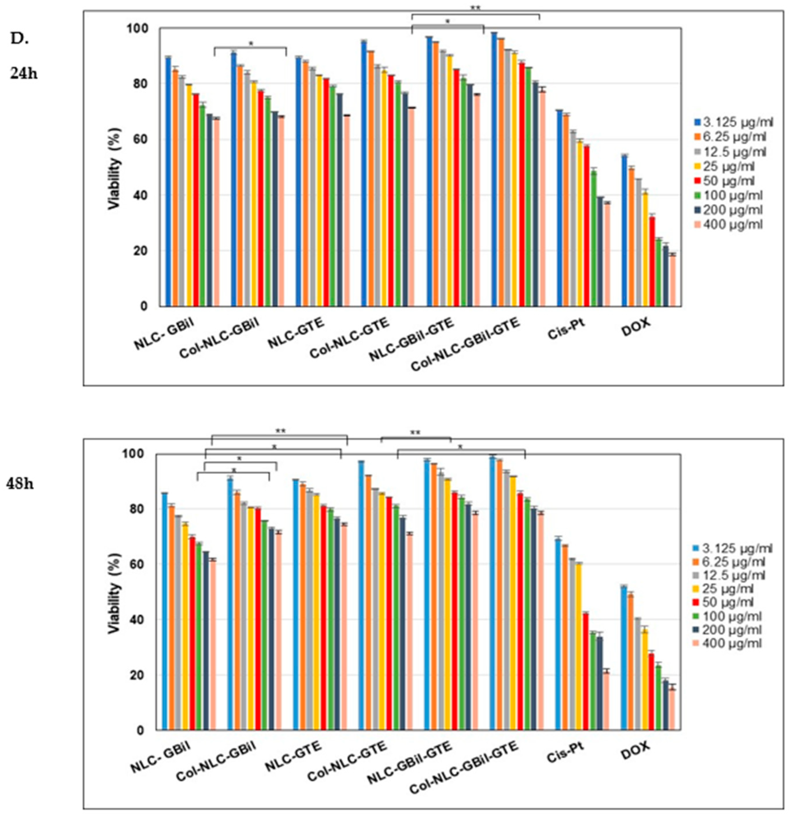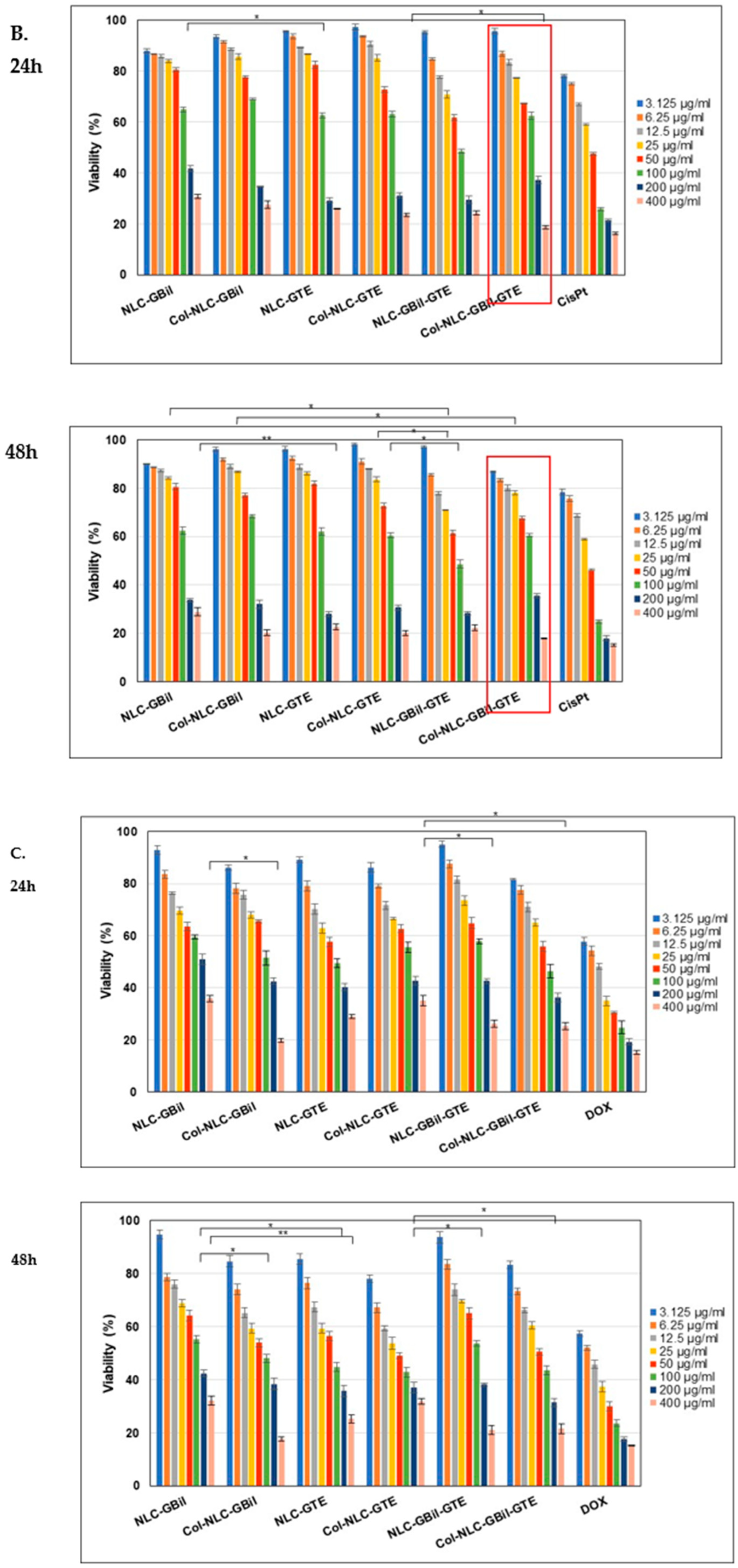 2.3. Outcomes of In Vitro Antitumoral Effect of NLC- and Col-NLC-GBil-GTE