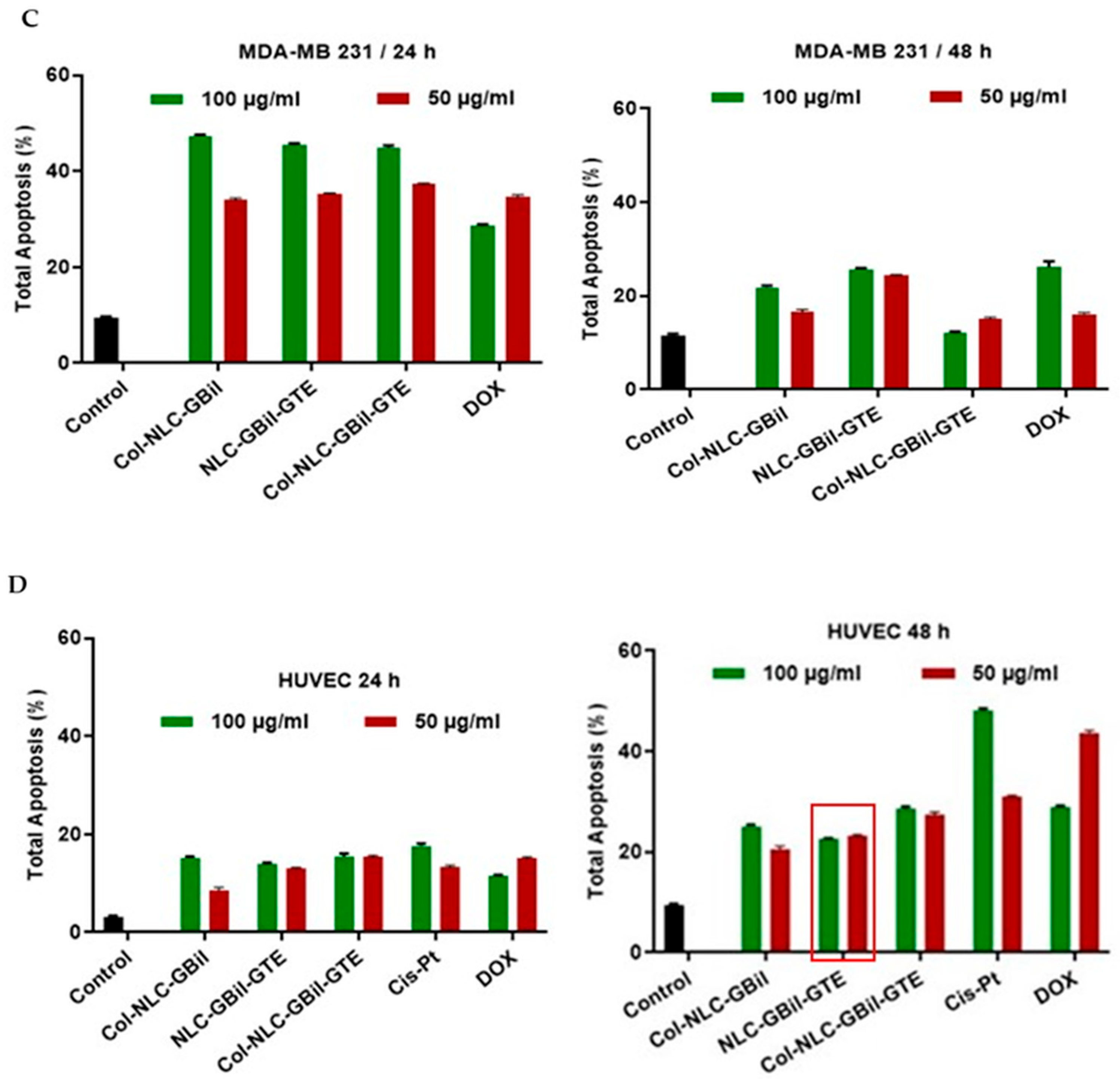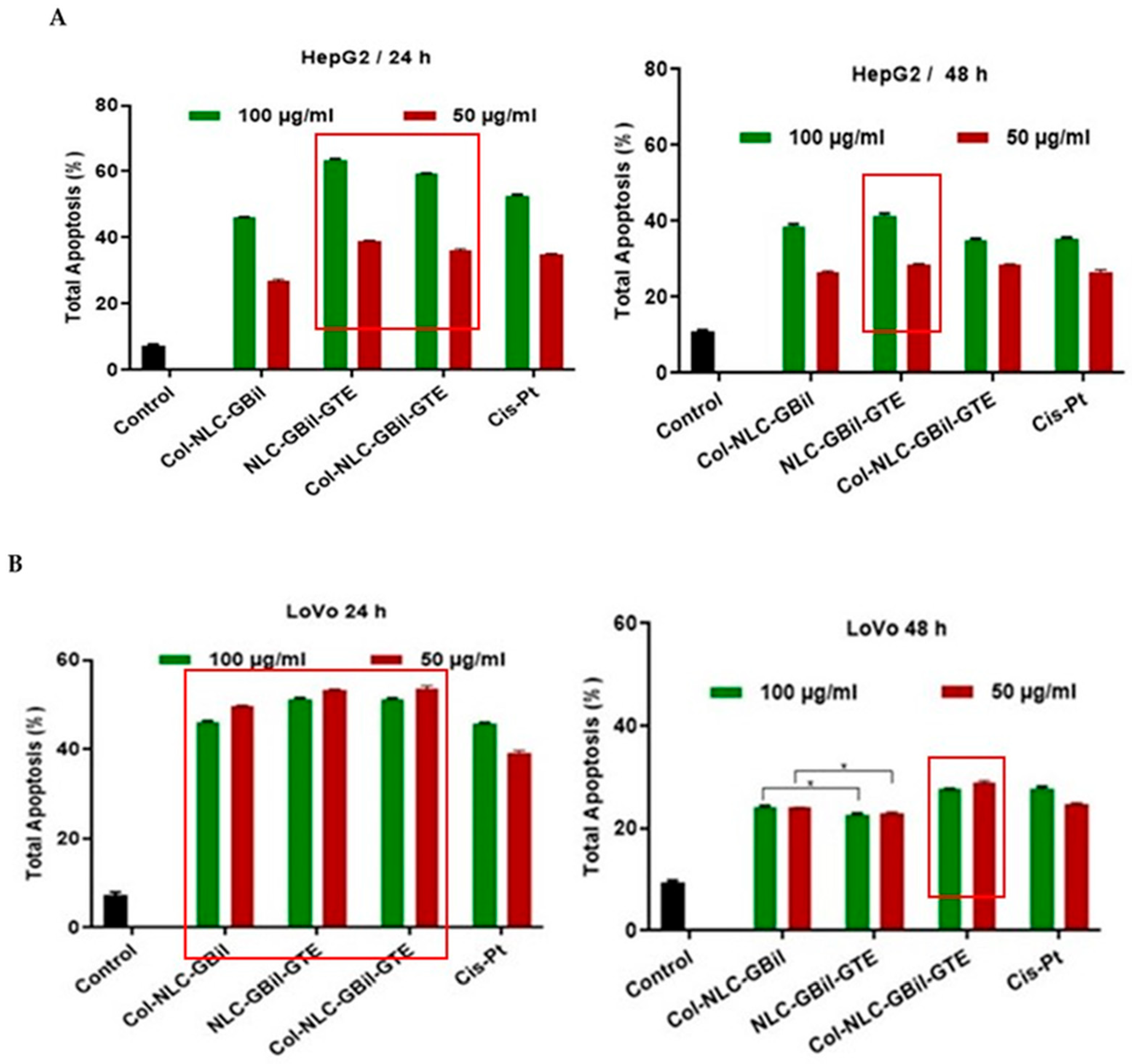 2.3.2. Apoptosis Induced by NLC- and Collagen-Decorated NLC-GBil-GTE
