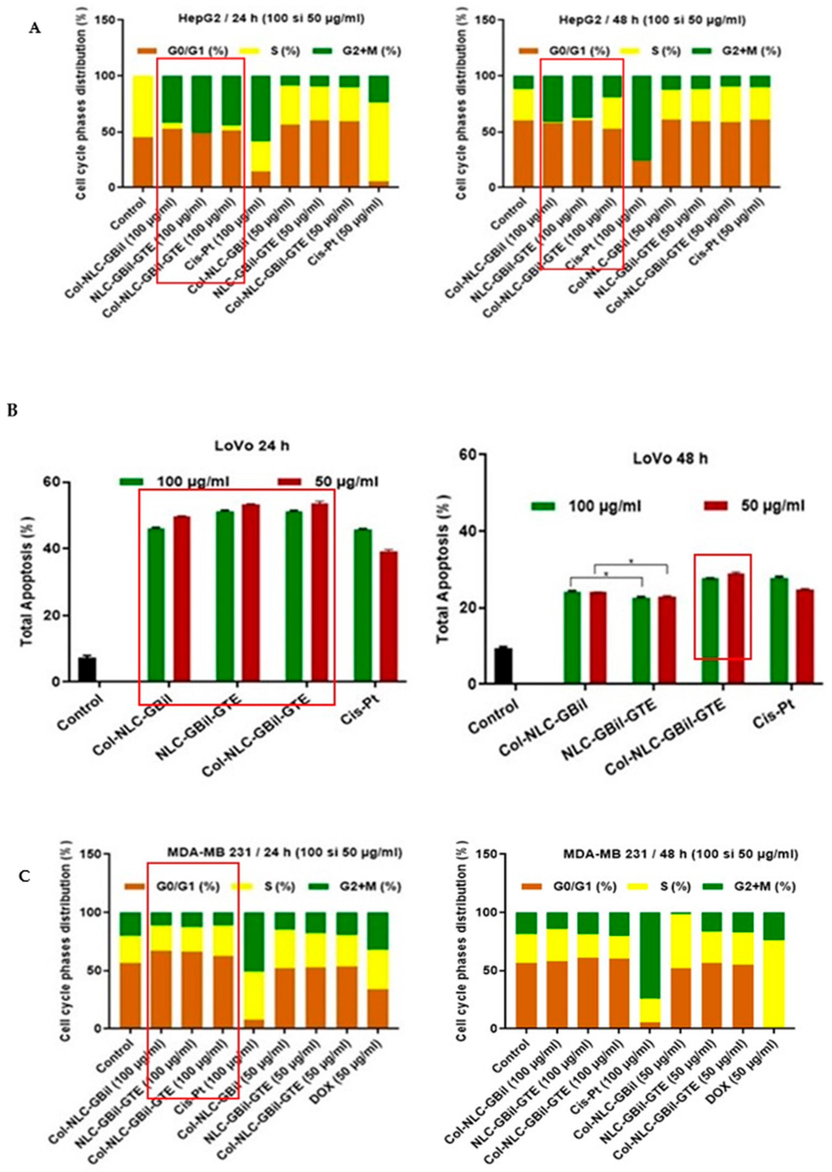 2.3.3. Cell Cycle Arrest by Col-NLC-GBil, NLC- and Col-NLC-GBil-GTE