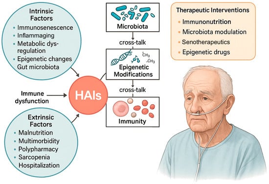Intrinsic and extrinsic factors contributing to HAIs in older adults. Aging-related mechanisms including immunosenescence, inflammaging, metabolic dysregulation, epigenetic alterations, and gut microbiota changes, interact with clinical determinants such as malnutrition, multimorbidity, polypharmacy, sarcopenia, and hospitalization, converging to cause immune dysfunction and increased infection risk. Cross-talk between microbiota, epigenetic modifications, and immunity further amplifies vulnerability. Potential therapeutic interventions include immunonutrition, microbiota modulation (e.g., probiotics, prebiotics, FMT), senotherapeutics, and epigenetic drugs. HAIs, healthcare-associated infections.