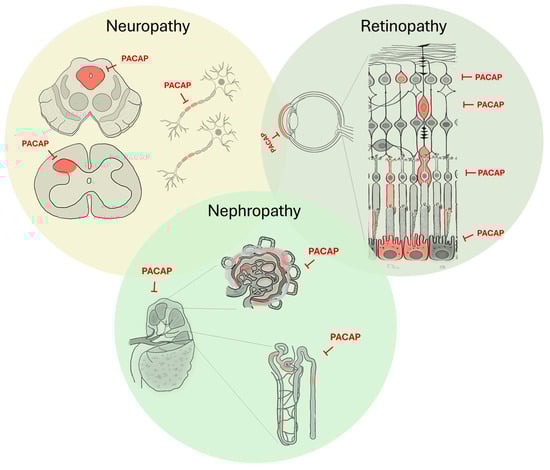 One of the most intensively studied actions of PACAP is its cellular protective effects exerted in different neuronal and non-neuronal cells [,,]. This cytoprotective action is mediated mainly by the PAC1 receptor, involving anti-apoptotic, anti-inflammatory and antioxidant effects. In vitro, PACAP has been shown to protect against, for example, cardiomyocyte apoptosis, endothelial dysfunction, cerebellar granule cell death, bacterial infections and intestinal inflammations [,,,,]. In vivo, this peptide is protective in animal models of neurodegenerative diseases, cardiomyopathy, colitis, ischemic lesions or amyloidosis [,,,,]. Diabetes is associated with several macro- and microvascular complications, affecting most organs, especially the kidney, eye and peripheral nerves. The protective effects of PACAP against different in vitro and in vivo toxic agents and factors leading to degenerative changes have already drawn attention to PACAP as a protective agent in diabetic complications []. The aim of the present review is to summarize data on the protective effects of PACAP in the three major complications of diabetes, diabetic retinopathy, nephropathy and neuropathy, as well as some other complications []. The main findings are summarized in Figure 1 and Table 1.