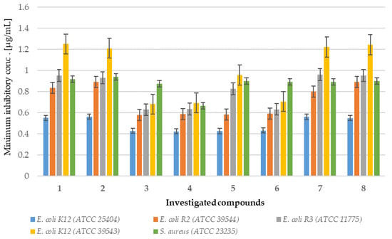 Minimum inhibitory concentration (MIC) of the coumarin derivatives 1–8 investigated in selected bacterial strains.