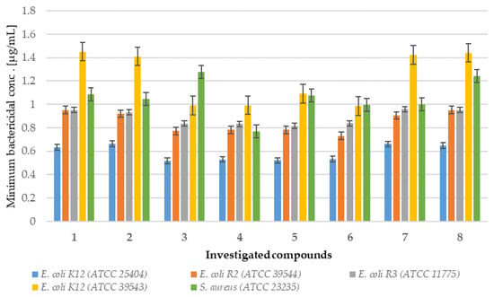 The MBC/MIC ratio of the coumarin derivatives 1–8 investigated in selected bacterial strains.