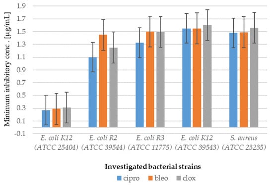 Examples of MIC with a bacterial model strain in selected strains of E. coli and S. aureus for studying antibiotics ciprofloxacin (cipro), bleomycin (bleo) and cloxacillin (clox).