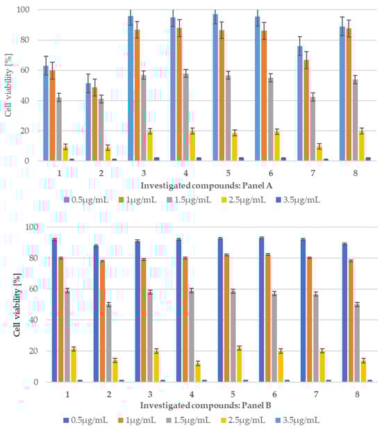 However, a gradual reduction in viability was caused by compounds tested 1–8 at 1 μg/mL, with cell viability percentages ranging from 99.8% to 98% for compounds 1–4 and 52.50% for peptidomimetic 8, (Figure 6, Panel A and B, Figure S6 in the Supplementary Materials). The obtained results were used to calculate the half-maximal inhibitory concentration (IC50) for peptidomimetics 2 (IC50 6.58 µg/mL) and 8 (IC50 1.71 µg/mL) which penetrated the blood–brain barrier to the greatest extent, after 24 h of incubation with the most active antimicrobial peptidomimetics in both cases of used cell lines. The obtained IC50 value is comparable to the concentration value achieved in the brain, which would suggest an increase or decrease in the therapeutic dose (own observations).