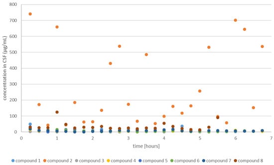 Time-resolved spectrophotometric measurements were performed to determine the concentrations of the investigated compounds in CSF. A pronounced influence of the structural features of the examined coumarin derivative on the analyte concentration within the studied temporal regime was observed (adjusted p-value = 0.024) (Figure 8).