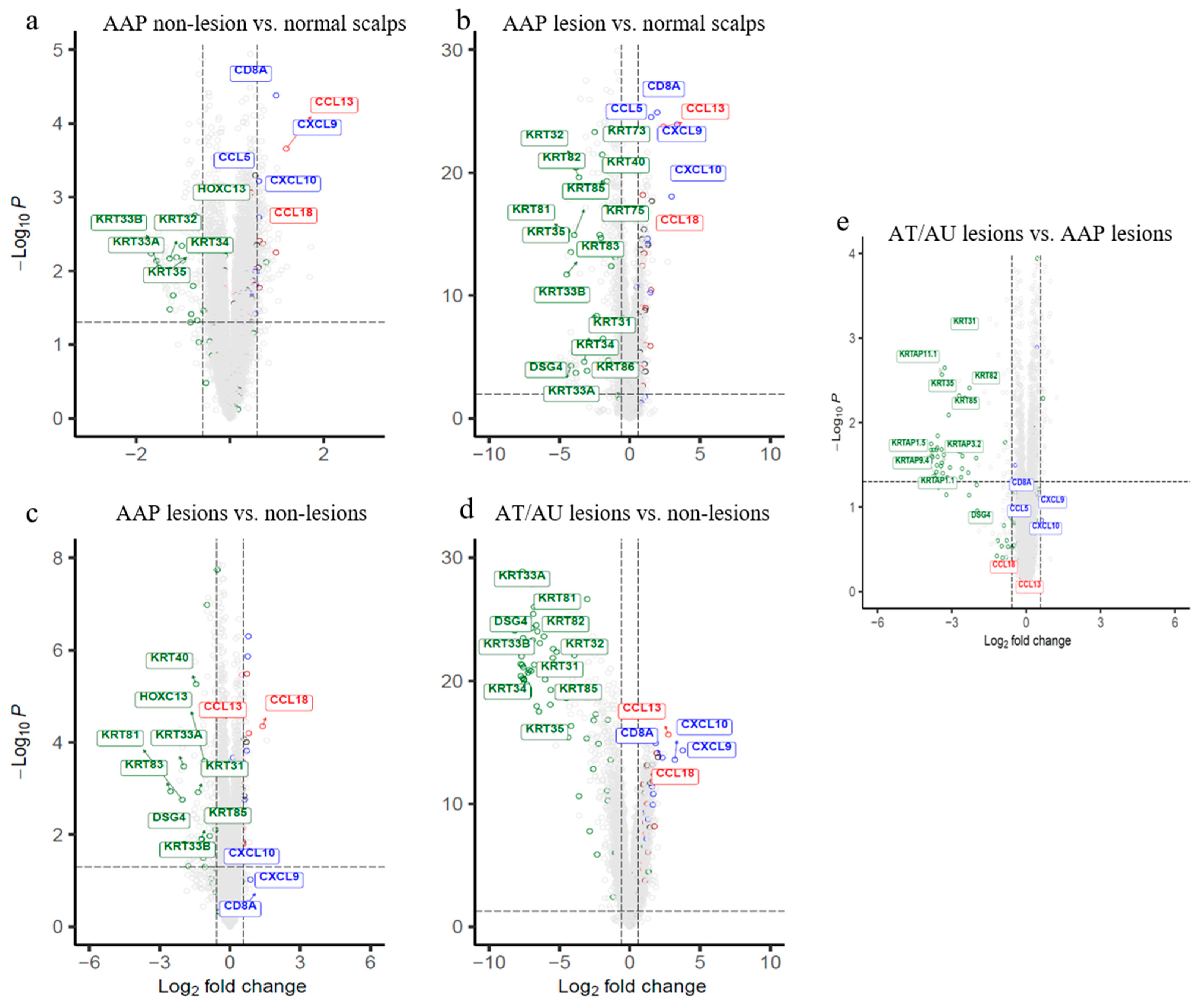 This analysis delineates subtype-specific molecular profiles, highlighting a gradient of severity from non-lesional to lesional states. Non-lesional AAP scalp compared to normal controls identified distinct patterns of upregulated immune and metabolic genes as well as downregulated structural and regulatory genes. Non-lesional AAP scalp exhibited early immune activation, marked by elevated expression of Type 1 immunity genes (CXCL9, CXCL10, CCL5, CD8A, killer cell lectin like receptor K1 (KLRK1)) and Type 2–linked chemokines (CCL13, CCL3, CCL3L1, C-C motif chemokine ligand 3 like 3 (CCL3L3)), and innate receptors (toll-like receptor 1 (TLR1), C-type lectin like 1 (CLECL1)), along with downregulation of hair follicle–associated genes (HOXC13,KRT33A/B,KRT34/35), but remained molecularly more similar to normal scalp than to lesional areas. (Figure 1a, Supplemental Table S3).