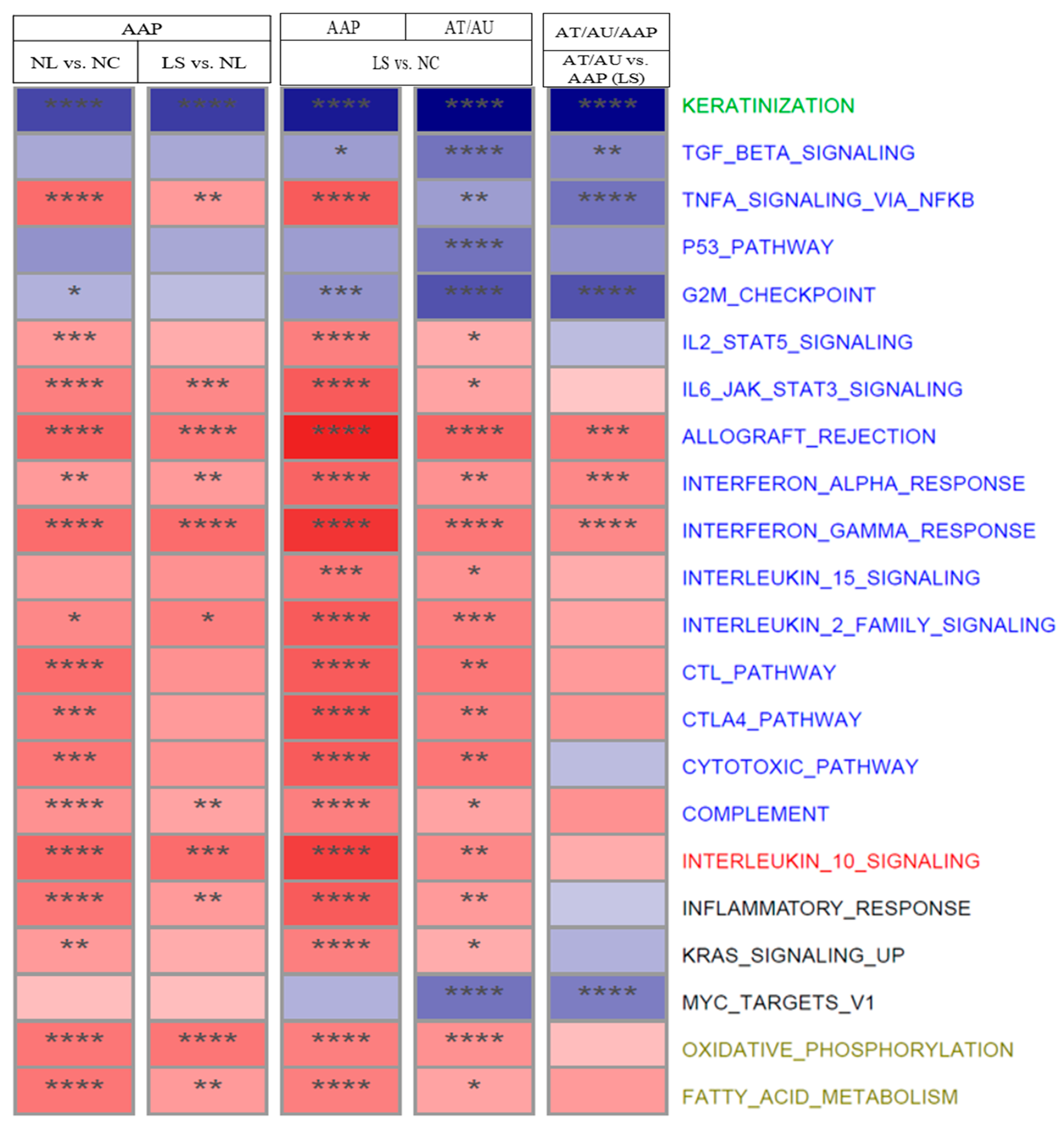 Figure 2. Pathway dysfunction across AA subtypes and scalp regions. The heatmap shows normalized enrichment scores (NES) for selected pathways across scalp comparisons: AAP NL vs. NC, LS vs. NL, LS vs. NC, and AT/AU LS vs. AAP LS. Red indicates activation, and blue indicates suppression in the listed comparisons. Asterisks denote significance (**** FDR < 0.001, *** FDR < 0.01, ** FDR < 0.05, and * FDR < 0.1). Pathways are color-coded by function: keratinization (green), immune (blue), regulatory (red), other (black) and metabolic (khaki).