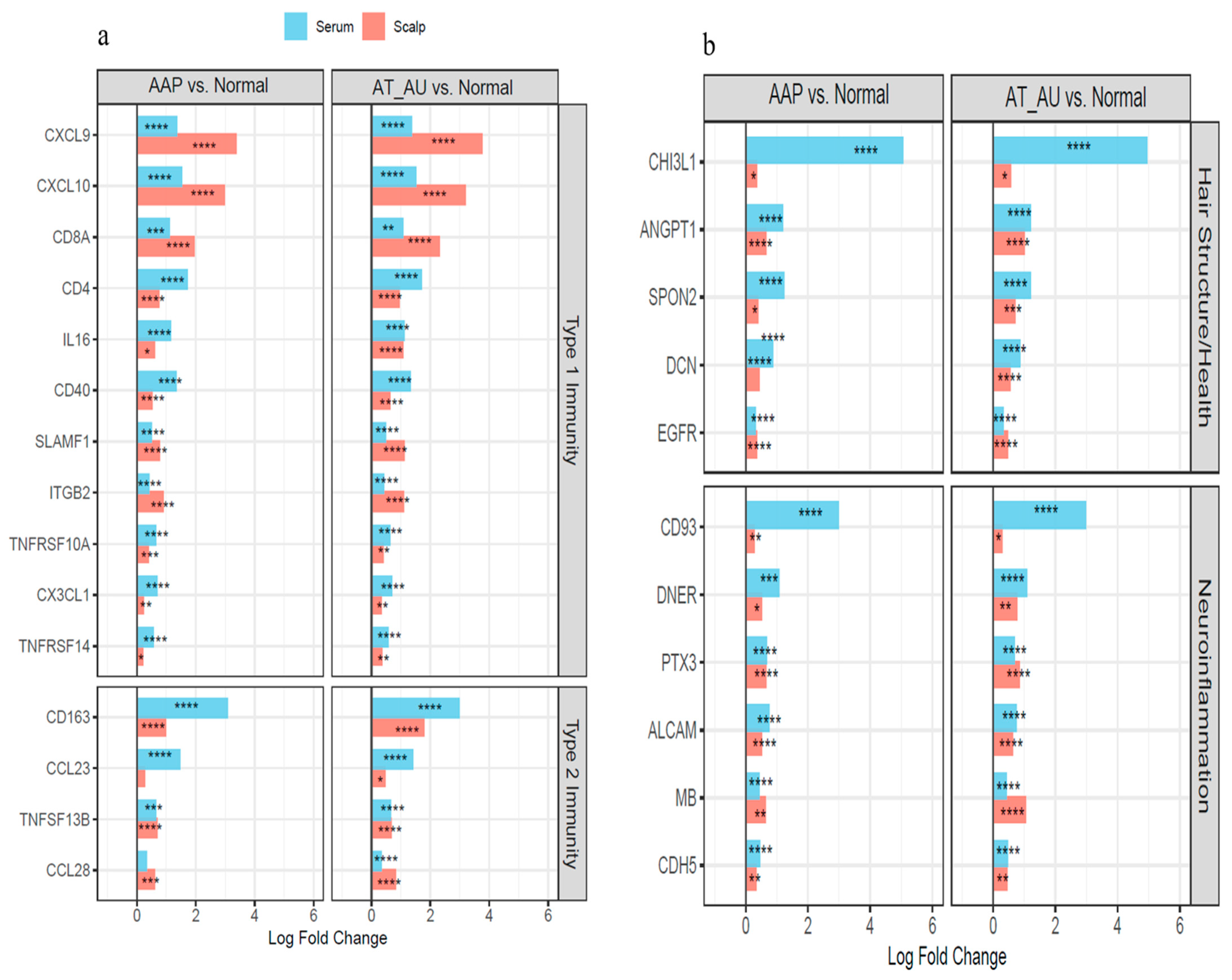Figure 3. Coordinated immune activation and tissue remodeling in the scalp and serum of AA subtypes. (a) Type 1 and Type 2 immunity-related genes show parallel upregulation in both scalp and serum, reflecting local and systemic immune activation. (b) Hair structure and neuroinflammation-related genes are consistently elevated across tissues, indicating follicular disruption and inflammatory remodeling. Bars represent log fold changes in AAP and AT/AU vs. controls; red = scalp, blue = serum. **** FDR < 0.0001, *** FDR < 0.001, ** FDR < 0.01, and * FDR < 0.05.