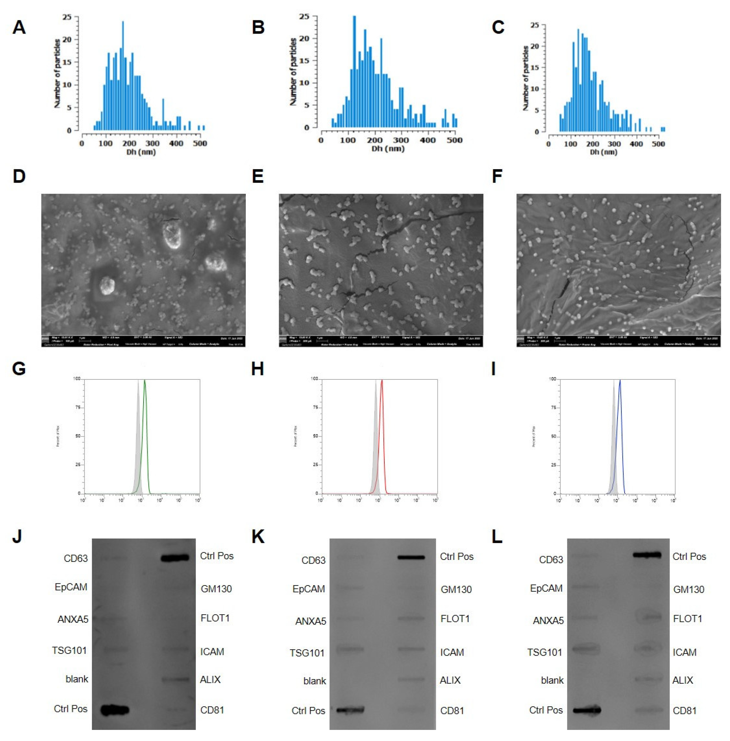 Transmission electron microscopy (TEM) further confirmed the nanoscale dimensions and typical vesicular morphology of all the isolated EVs (Figure 2D–F). The images revealed round to biconcave structures consistent with the size measurements obtained via VideoDrop (Figure 2A–C), supporting their classification as EVs. The classification and molecular profiling of EVs were carried out in strict adherence to the MISEV guidelines, ensuring compliance with internationally accepted standards for EV characterization. Flow cytometric analyses consistently demonstrated the robust expression of the canonical tetraspanin marker CD81 across all EV populations, thereby validating their vesicular nature (Figure 2G–I). These findings were corroborated by Western blot analysis, which further confirmed CD81 positivity, reinforcing the reliability and reproducibility of the classification pipeline. Beyond CD81, Western blot profiling revealed the presence of additional vesicle-associated proteins, including CD63, EpCAM, and Annexin, each of which is widely recognized as a defining component of EV subtypes (Figure 2J–L). The concurrent detection of these markers across orthogonal platforms not only substantiates the identity of the isolated vesicles but also underscores the methodological rigor and molecular integrity of the preparations. This multi-parameter validation strategy provides a solid framework for downstream functional studies and strengthens the translational relevance of the isolated EVs.