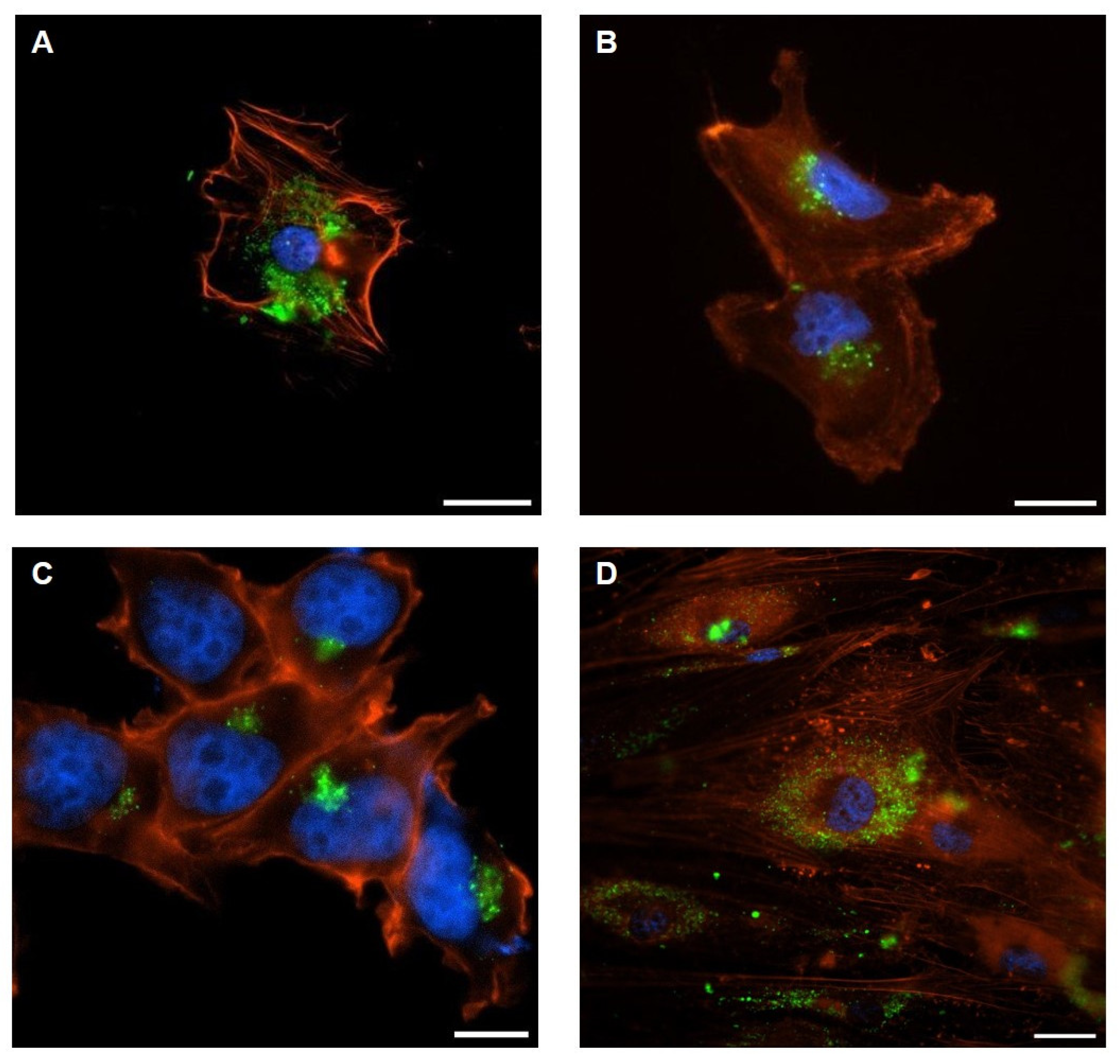 Figure 3. Representative confocal images of EV-internalization: (A) adipocytes incubated with TdEVs from metastatic cells; (B) metastatic cells incubated with AdEVs; (C) non-metastatic cells incubated with AdEVs; (D) adipocytes incubated with TdEVs from non-metastatic cells. Vesicles labeled with PKH67 (green), cell nuclei with DAPI (blue), and actin filaments with AlexaFluor555-Phalloidin (red). Scale bar = 10 µm.