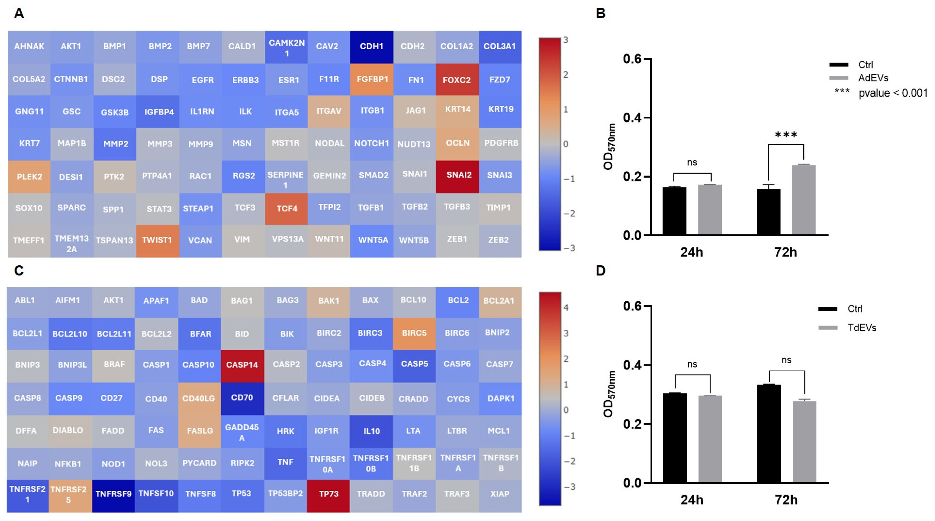Figure 4. Communication between adipocytes and metastatic breast cancer (BC) cells is mediated by extracellular vesicles (EVs). (A,C) Gene expression profile of EV-treated cells: (A) Activation of epithelial-to-mesenchymal transition (EMT) program in metatastic BC cells after adipocyte-derived EV (AdEV) exposure; (C) modulation of apoptotic pathway genes in adipocytes treated with tumor-derived EV (TdEV) from metatastic BC cells. Heat map Log(2) fold change. (B,D) Cell proliferation after EV treatment over a 72 h period: (B) Proliferation of metastatic BC cells after AdEV treatment; (D) adipocyte proliferation following treatment withTdEV from metatastic BC cells. Sample size 9.