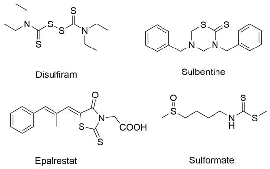 On the other hand, organic dithiocarbamates, recognized as versatile scaffolds in organic chemistry, have found applications across numerous fields, including organic synthesis, environmental and material sciences, the polymer industry, agrochemicals, and pharmaceuticals [10,11,12,13,14,15,16,17,18,19]. Notably, they also demonstrate promising biological activities such as antibacterial, antioxidant, anticancer, and antifungal effects. Originally employed as pesticides throughout the 20th century, dithiocarbamates are among the simplest organosulfur compounds and are widely acknowledged for their metal-chelating abilities. However, their chemical and pharmacological potential extends far beyond metal binding. Over the last decade, extensive studies have revealed a broad spectrum of chemical and medicinal properties associated with dithiocarbamate derivatives [20,21,22,23,24,25]. The dithiocarbamate group forms the core structure of Disulfiram, a drug originally used for treating chronic alcoholism, which has more recently shown potential as an anticancer agent [26,27]. Additionally, the dithiocarbamate moiety serves as a key pharmacophore in other marketed drugs, including sulbentine, epalrestat, and sulforamate, which exhibit a range of biological activities [28,29,30] (Figure 2).