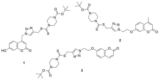 The first literature reports on coumarin–dithiocarbamate hybrids with cytotoxic activity date back to 2013. Duan et al. demonstrated that 1,2,3-triazole–dithiocarbamate hybrids containing a coumarin moiety exhibited potent anticancer activity [31]. The autors evaluated the inhibitory concentrations (IC50), representing the amount of compound needed to suppress 50% of tumor cell growth, against four human cancer cell lines: MGC-803 (gastric), MCF-7 (breast), PC-3 (prostate), and EC-109 (esophageal). The measurements were carried out using the MTT assay technique. Among the tested compounds containing a coumarin moiety in their structure, tert-butyl 4-(((1-((7-hydroxy-2-oxo-2H-chromen-4-yl)methyl)-1H-1,2,3-triazol-4-yl)methylthio)carbonothioyl)piperazine-1-carboxylate (1) exhibited good anticancer activity against MGC-803 (IC50 = 4.96 ± 0.78 µM) and MCF-7 (IC50 = 10.44 ± 2.34 µM) cell lines in comparison to the reference compound 5-fluorouracil (5-FU) (IC50 = 7.01 ± 1.34 µM and 7.54 ± 0.7 µM, respectively). Other tested coumarin derivatives were less active, MGC-803 (IC50 = 76.90 ± 3.56 µM) and MCF-7 (IC50 = 90.38 ± 4.05µM) for tert-butyl-4-(((1-(2-(4-methyl-2-oxo-2H-chromen-7-yloxy)ethyl)-1H-1,2,3-triazol-4-yl)-methylthio)carbonothioyl)piperazine-1-carboxylate (2) and for tert-butyl-4-(((1-(2-(2-oxo-2H-chromen-7-yloxy)ethyl)-1H-1,2,3-triazol-4-yl)methylthio)-carbonothioyl)piperazine-1-carboxylate (3) IC50 = 67.05 ± 2.98 µM and 79.80 ± 3.09 µM, respectively (Figure 3).
