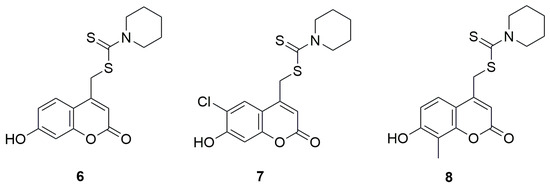 Another group of coumarin derivatives with anticancer activity, containing the dithiocarbamate fragment was evaluated by the methyl thiazolyl tetrazolium (MTT) method against hepatoma carcinoma cells HCCLM-7, cervical carcinoma cells Hela, mammary adenocarcinoma cells MDA-MB-435S, colon carcinoma cells SW-480, laryngocarcinoma cells Hep-2, and mammary adenocarcinoma cells MCF-7 [34]. Derivatives of 7-hydroxycoumarin, 6-chloro-7-hydroxycoumarin, and 8-methyl-7-hydroxycoumarin were investigated, each bearing a methylamine-1-carbodithioate moiety at the C-4 position of the coumarin ring and incorporating various aliphatic amines such as diethylamine, piperidine, morpholine or phenylpiperazine. The results showed that the best activity was observed for derivatives containing a piperidine moiety in their structure. The activity of (7-hydroxy-2-oxo-2H-chromen-4-yl)methylpiperidine-1-carbodithioate (6) (Figure 6) against all six tested cell lines was better that of 5-FU. Particularly low IC50 values for compound 6 were obtained against HCCLM-7 and MCF-7 cell lines, amounting to, respectively, 3.5 μM and 3.0 μM while for 5-FU it was 18.6 μM and 8.1 μM, respectively. Similar results were obtained for (6-chloro-7-hydroxy-2-oxo-2H-chromen-4-yl)methylpiperidine-1-carbodithioate (7), 12.3 μM against Hela, 11.6 μM against SW-480, and 44 μM against Hep-2, while it was 128.7 μM, 91 μM and 44 μM for 5-FU, respectively. Compound 8-(7-hydroxy-8-methyl-2-oxo-2H-chromen-4-yl)methyl piperidine-1-carbodithioate exhibited similar behavior, with IC50 values 2.5 μM against Hela, 15.3 μM against SW-480 and 7.8 μM against Hep-2. In summary, the introduction of an additional methyl group at the C-8 position of the coumarin ring or a chlorine atom at the C-6 position did not significantly affect the activity. However, the substitution of an additional hydroxyl group or the replacement of piperidine with another amine resulted in a drastic reduction of cytotoxic activity, which was significantly lower than that of the reference compound.