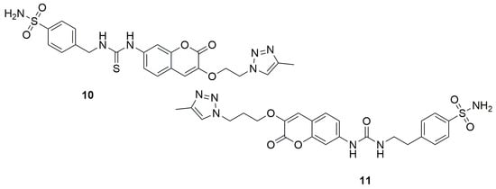 A slightly different set of coumarin structure modifications was carried out in 2024 by the research group led by Begines [36]. The authors synthesized a series of novel coumarin derivatives based on hybridization with arylsulfonamide or biotin scaffolds and tested them as inhibitors of four different human carbonic anhydrase isoforms: hCA I, II, IX, and XII, which are involved in the pathogenesis and progression of many types of solid tumors. N-[[(4-Aminosulfonyl)phenyl]methyl]-N’-[[(4-methyl-1H-1,2,3-triazol-1-yl)ethoxy]-2-oxo-2H-1-benzopyran-7-yl]thiourea (10) (Figure 8), a coumarin-sulfonamide compound containing a thiourea group and a triazole linker, exhibited the strongest inhibitory effect on hCA XII, with a KI value of 7.5 nM, and demonstrated excellent selectivity compared to hCA I. Meanwhile, N-[[(4-aminosulfonyl)phenyl]ethyl]-N’-[[(4-methyl-1H-1,2,3-triazol-1-yl)propoxy]-2-oxo-2H-1-benzopyran-7-yl]urea (11) turned out to be the most effective inhibitor of hCA IX, showing a KI of 6.3 nM—making it four times more potent than the reference drug acetazolamide (AAZ), which has a KI of 25 nM. Additionally, compound 11 displayed outstanding selectivity over the hCA I and II isoforms.