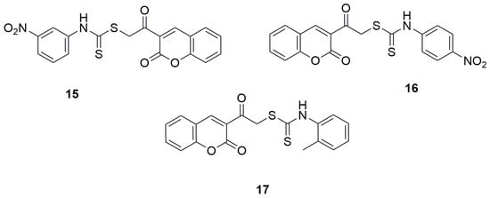 In 2021, two independent studies were conducted, where series of novel coumarin–dithiocarbamate derivatives were designed, synthesized and tested for alpha-glucosidase inhibitory activities by preparing mixture of alpha-glucosidase (Saccharomyces cerevisiae, EC3.2.1.20), potassium phosphate buffer and different concentrations of synthesized compounds in 96-well plate, incubating for 10 min in 37 °C, adding p-nitrophenyl glucopyranoside and incubating in 37 °C for 20 min. DMSO (10% final concentration) was used as negative control and acarbose was used as positive control. Finally, absorbance was detected at 405 nm and IC50 values were calculated. Among the group of 3-(2-[(phenylcarbamothioyl)sulfanyl]acetyl)-2H-chromen-2-one derivatives synthesized by Elahbaadi and co-workers, the most potent inhibitory activity was exhibited by 2-oxo-2-(2-oxo-2H-chromen-3-yl)ethyl(3-nitrophenyl)carbamodithioate (15) and 2-oxo-2-(2-oxo-2H-chromen-3-yl)ethyl(4-nitrophenyl)carbamodithioate (16), with IC50 values of 101.6 ± 4.7 µM and 85.0 ± 4.0 µM, respectively [47] (Figure 11). In comparison, acarbose showed an IC50 of 750.0 ± 9.0 µM in the same study. However, it should be emphasized that all the evaluated compounds exhibited markedly stronger inhibitory effects than the reference drug acarbose. However, compounds containing electron-withdrawing substitutions on the aryl group, such as nitro groups or halogens, showed the highest activity. The activity slightly decreased for derivatives with an electron-donating substituents, like a methyl group in the ortho position of the phenyl moiety, IC50 = 560.6 ± 8.6 for 2-oxo-2-(2-oxo-2H-chromen-3-yl)ethyl-o-tolylcarbamodithioate (17) [47] (Figure 11).