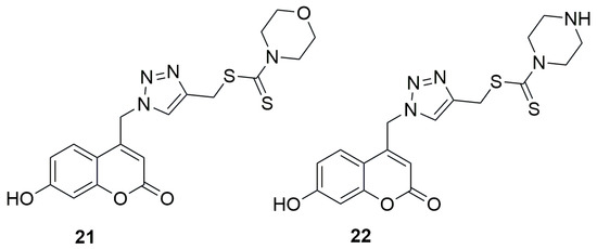 Structures of {1-[(7-hydroxy-2H-chromen-2-one-4-yl)methyl]-1H-1,2,3-triazol-4-yl}methylthio)carbonothioyl)morpholine (21) and {1-[(7-hydroxy-2H-chromen-2-one-4-yl)methyl]-1H-1,2,3-triazol-4-yl}methylthio)carbonothioyl)piperazine (22).