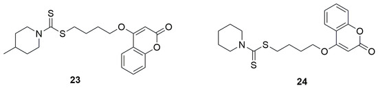 Structures of 4-(2-oxo-2H-chromen-4-yloxy)butyl-4-methylpiperidine-1-carbodithioate (23) and 4-(2-oxo-2H-chromen-4-yloxy)butyl piperidine-1-carbodithioate (24).