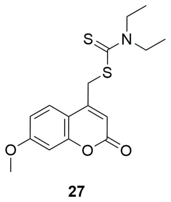 Structure of ((7-methoxy-2-oxochromen-4-yl)methyl)-N,N-diethyldithiocarbamate (27).